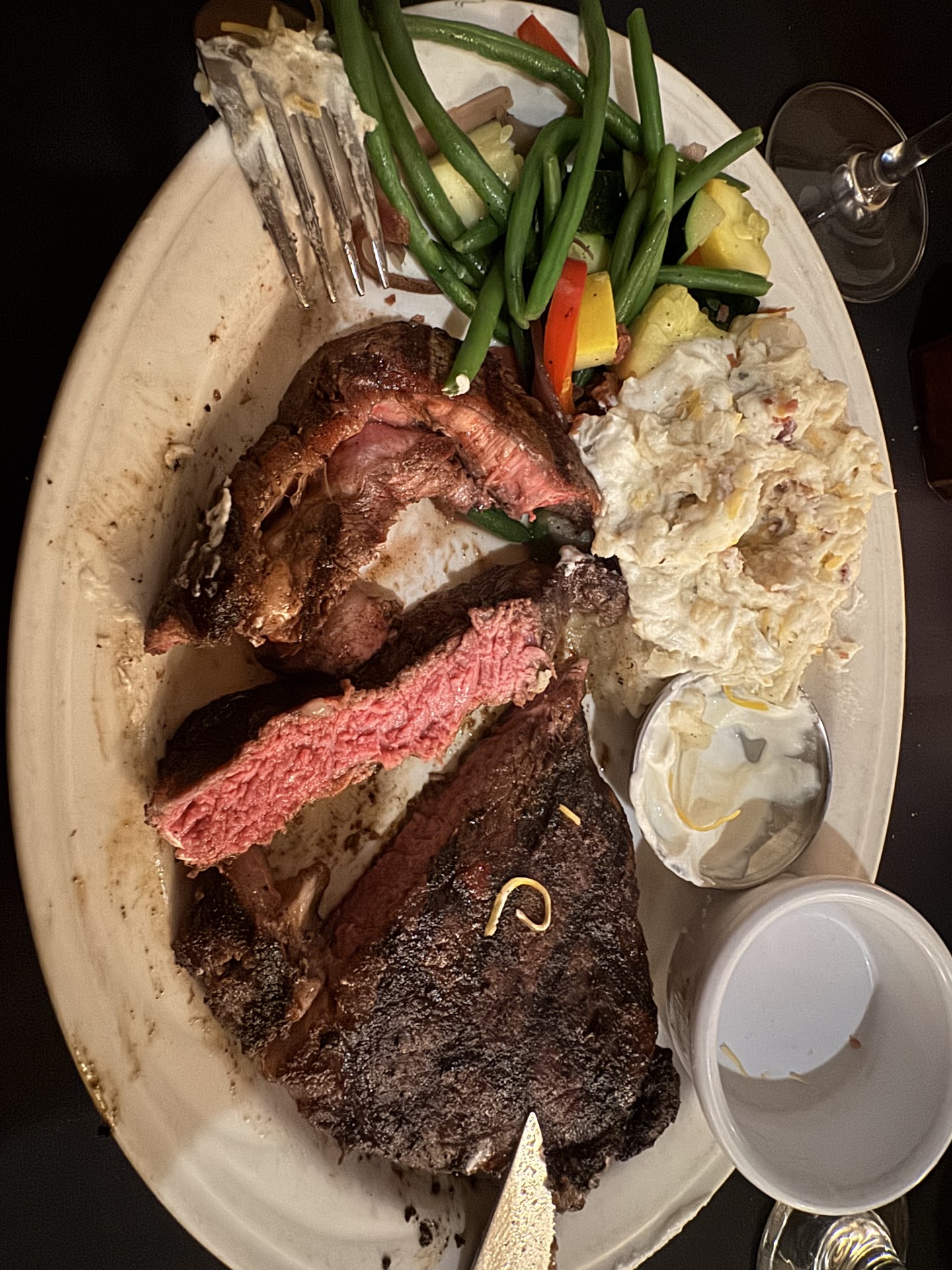 Went here for my birthday. Food: Food was cold, my husband did say something about it and they “warmed it” up so they took it back. I’m skeptical about sending food back so I left mine as is. That piece of meat had so much fat in it and looked gross. He ate around it but left a big chunk of fat aside. I don’t think that’s what prime rib is supposed to look like. As for my steak, I had ribeye asked for it medium well and as you can see it was medium rare? We didn’t touch the veggies that were served with it. We did get loaded mashed potatoes, they were okay. Didn’t care for the salad or rolls they were bland, we were there for the meat which was unfortunately a bummer. I had a cheap wine, which I then noticed I could have bought a whole bottle for the price we paid. My main issue was the steaks, I was really looking forward good food and was really disappointed and disgusted by all that fat on the prime rib. Service: it was okay, not great. The server checked on us a couple of times and seemed to have been very busy didn’t bother coming back. Did seem like everyone was busy serving. Atmosphere: We wanted a quiet space to enjoy my birthday dinner and it was a bit loud it was nice inside though. There was a table we sat next to, it was a big group and they had kids who were sitting with their feet up on the chair, (they were laying on the chair and their feet were up on the back rest). Yes it’s a family friendly place but nobody wants to see feet up while they’re eating. That’s not the restaurants fault but it was still happening there. We did ask if there was a more quiet area to sit at and they did not accommodate for us they said we had to make a reservation for it and we were already there (also it did not look like it was busy on the other side) but we didn’t argue about it. I tried to make the most out of it since it was my birthday but we will not be back to this place, I do not...