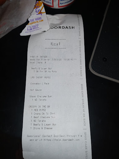 Read moreI don't go to Taco Bell very often but my husband wanted taco so I went. I went to the drive through and ordered for myself, so and husband. I got home and realized none of the food I ordered for myself was in the bag. I drove back down super irritated, went in and told them I didn't get some of the food I ordered and asked them to throw in a burrito on the house since I had to drive all the way back for the rest of my food. The young man at the counter Immediately apologized and got a manager. The manager apologized as well and said they would most definitely give me a burrito on the house and apologized. Another random employee that passed by the register also apologized. Wow what amazing customer service!!! If these employee's could get an adaboy from someone above them that would definately be deserved. My visit was tonight 2/24/19 at around 9:30pm!! Thank you Taco Bell for the amazing customer service!!...
