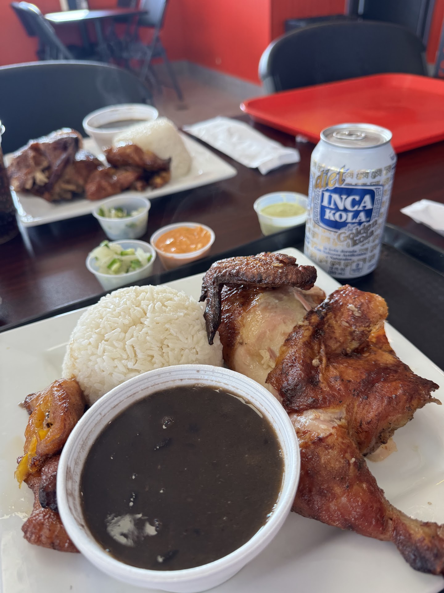 This must be a fairly new La Granja! I haven't been over this way in awhile and it wasn't here the last time I was in this plaza. Very spacious and clean. Menu is large and easy to follow. Food came out very quickly as well. So let me say, la granja is absolutely not "just a fast food restaurant" it is a restaurant that just so happens to have a drive through. This food is a cut above others. 100%. I have been to several Peruvian restaurants, and La granja is still my favorite. They have THE BEST aguadito. Their lomo salteado is so so so good. And their Chupe is fantastic. Can't go wrong with their seafood rice either. This will also sound silly. But their white rice is some of the best damn white rice I've ever had. I don't know what kind of magic is going into that stuff, but it's perfect. I can only assume it's cooked with lard? I am in love with their white rice. If you want amazing Peruvian food, please come here and give them some love...
