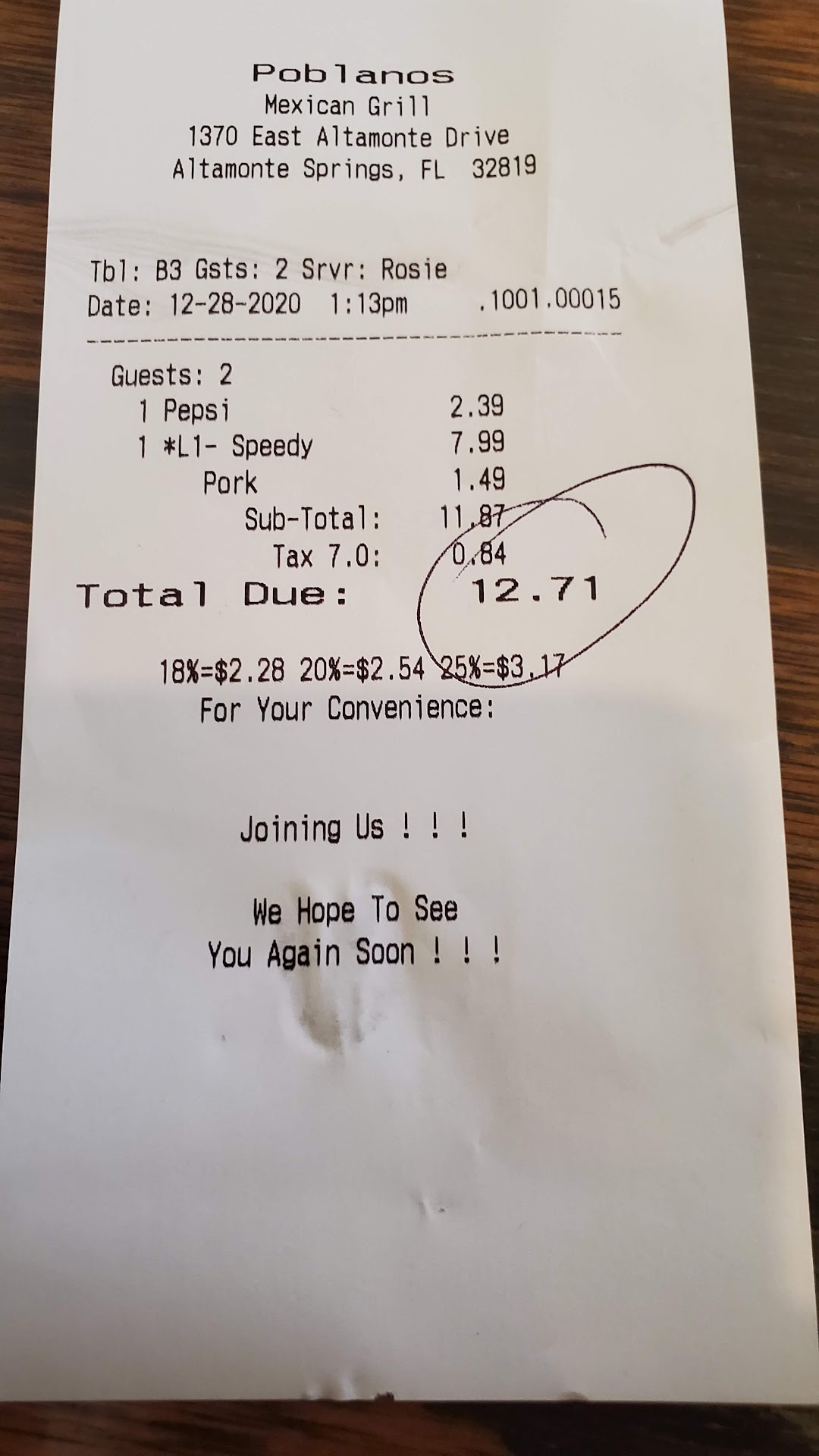 My father and I go out weekly, usually go to get gas and do lunch. Pop wanted to go to Willie's Pinchos in Orlando but found they were closed so I suggested Poblanos. I'd eaten here previously with a former boss, and enjoyed it so I'd suggested to Pop to check em out.