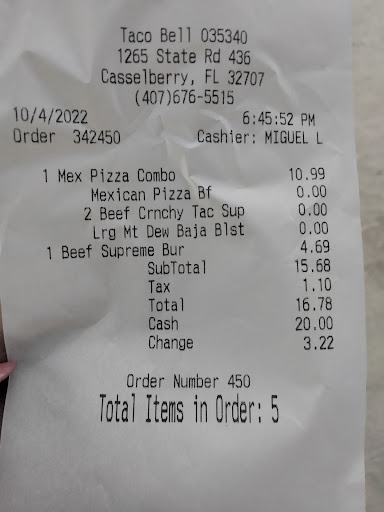 Read moreThe manager Miguel if that is his real name should NOT be a manager at this location 1265 State Rd 436 Casselberry Fl. My aunt whom is disabled and unable to see needed a little time to understand what she wanted from the menu. Mr. Miguel thought that we were taking to long to order so he rushed us through the drive thru. Mr. Miguel was very rude, nasty, and very impatient because he had to add or remove items from the order because my uncle changed his mind on an item. Mr. Miguel felt that he was waisting time taking our order. I understand time is the issue but with disabled individuals it takes time to order. Especially if they are unable to see. Mr. Miguel thought that his response to me was appropriate. Miguel as a General Manager myself I would never be rude to a customer because my staff is watching me. I did notice that your person in the grill needed to see what we were talking about and came close to the window to hear. Mr. Miguel leading by example is so important. I never write reviews but this one is warranted. Next time just please be patient with customers. You do not know that for instance my aunt and uncle are disabled and need maybe a little time to place an order. Don't make them think they need to be rushed or if she is a bother to someone because it takes her some time to place her order. My uncle also got nervous and really did not want his food because he felt you might do something to it. People should never have to feel this way. Just because the MANAGER feels customers are taking to long to order. Patience and being polite with amazing customer service is the key to success. That's my advise. They really wanted Taco Bell after not going for...