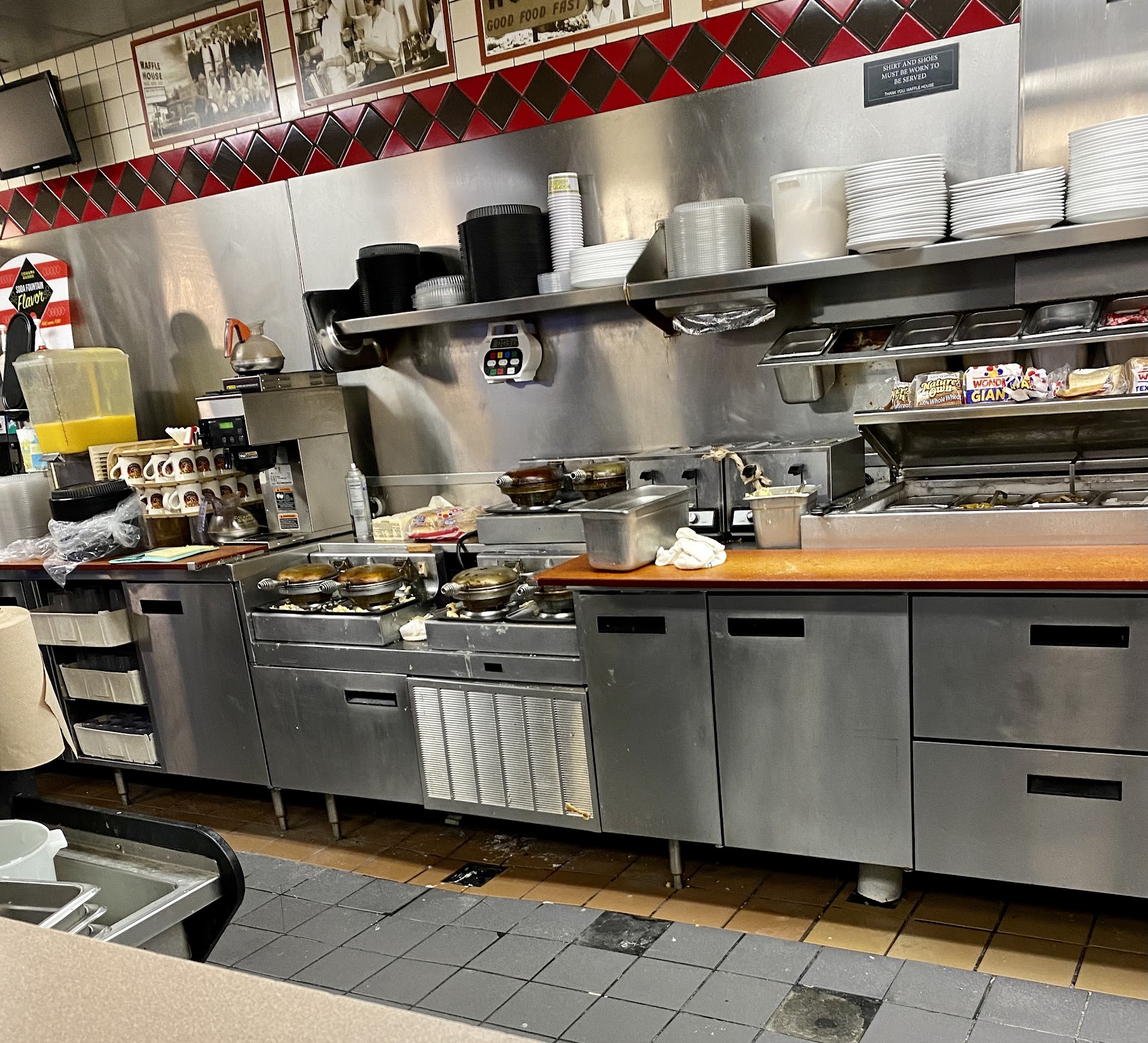 Read moreTo start off, my mom (who is handicapped) and I walked in and instead of getting a friendly "welcome to Waffle House!" Like the other customers with no disabilities, we got dirty stares and snickering. We took a seat at a table and it was dirty. Then this lady comes over and asks us what we wanted to drink and we told her what we would like and she seemed okay, until she left us for a good 10 minutes without taking our order. We sat there and watched her have a laugh with her co workers. We would understand if she was doing something productive and work related, but she was sitting there having a conversation with her co workers. I guess she finally remember about us and came back over to take our order. And we waited a decent amount of time and our food came out. Now this is what you really go for, the food. It was awful. My mom ordered a waffle with some eggs and it was nothing like it should taste. The waffle was all soggy and gross. Then I had ordered a chicken bacon burger and It was terrible. The buns couldn't hold the burger and when you tried to cut it to eat the knife barely made it half way through the meat and the bun had dissolved. Honestly, I recommend you just take your money and go someplace like ihop or Bob Evans....