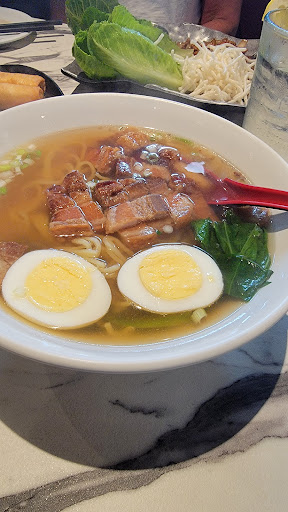 Had lunch here today and we thoroughly enjoyed our lunch. My daughter picked this place as she wanted to try something new and we were not disappointed. This was our first time trying Vietnamese cuisine so we weren't sure what to expect. I cannot remember the exact names of everything but I ordered the wide rice noodles with beef and it was tremendous. The beef had great flavor and noodles were delicious. My daughter had the Ramen soup with chicken and she loved it. The noodles were delicious and the broth was very flavorful. My wife has the fried rice with chicken. It was similar to a Chinese style fried rice with just a little bit of flavor change. This was also excellent. For an appetizer we ordered the spring rolls. They came quickly and hot with a wonderful sweet chili sauce. We were very happy we ordered these. (There were 4 but only 1 is pictured, they were that good). Our server was attentive, nice, and always available. The restaurant was quiet, clean and overall we had a great experience. If you're wondering if this place is worth trying out absolutely is. We intentionally did not eat breakfast and still did not come close to finishing any of our meals. We will definitely take friends and family here...