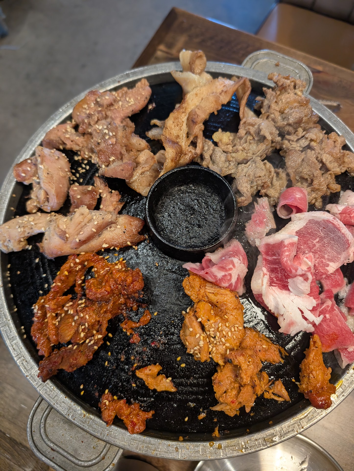 We did the all-you-can-eat option and were offered three appetizers to start (steamed egg, cheese corn, and dumplings), which were actually super tasty. But then the server took our menu before we could even order meat and said she’d just bring us “a bit of everything.” That was odd—normally you pick what you want.