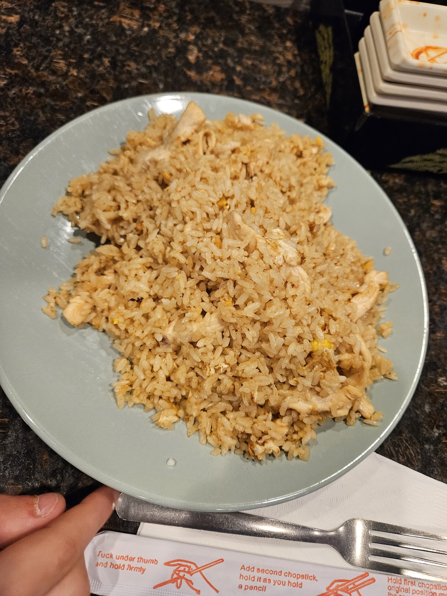 As far as the food is concerned, it was ok. It was nice that the chef gave us a piece of the steak to make sure it was cooked to our preference. However, there wasn't much substance to the fried rice. It made paying extra for the fried rice vs the steamed rice feel like a rip off. It was basically just rice, soy sauce, and a couple of eggs. The portions were pretty small as well, which is unusual for a hibachi place. The amount of soy sauce used was a bit excessive. My steak was incredibly salty. The rest of the food was ok, but again, small portions compared to many other places.