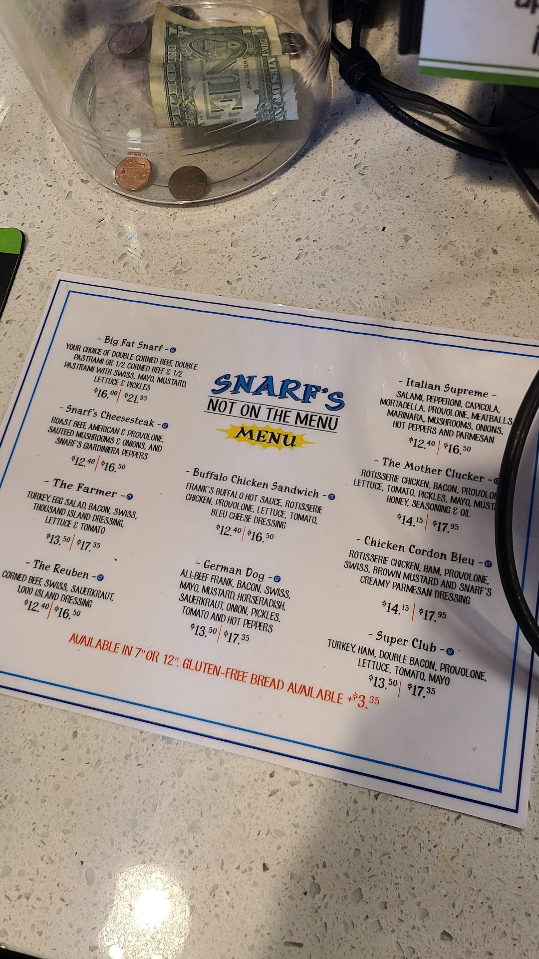 Read moreCan't rate the food...never got that far. I had never been to a Snarf's. We live in Castle Rock. After 9-miles of hiking on Monday morning, we decided to try our local Snarf's. We were immediately met with what appeared to be frustration that we were there from the young person running the register. Again, I have never been to a Snarf's before, so I am unfamiliar with how they do their ordering in comparison to other sandwich shops. The young person behind the register had no patience for me. After a rude response to me not understanding what he had asked me, I told my wife that we were done. We walked out. I did call and speak to the Manager and was told it would be addressed. However, this was literally my first experience ever with Snarf's. It will be my last. There are a lot of places to eat in Castle Rock and I'm not inclined to give my business to one that didn't seem to be interested. It's a shame that that young man doesn't understand the consequences of his actions. I hope he will...