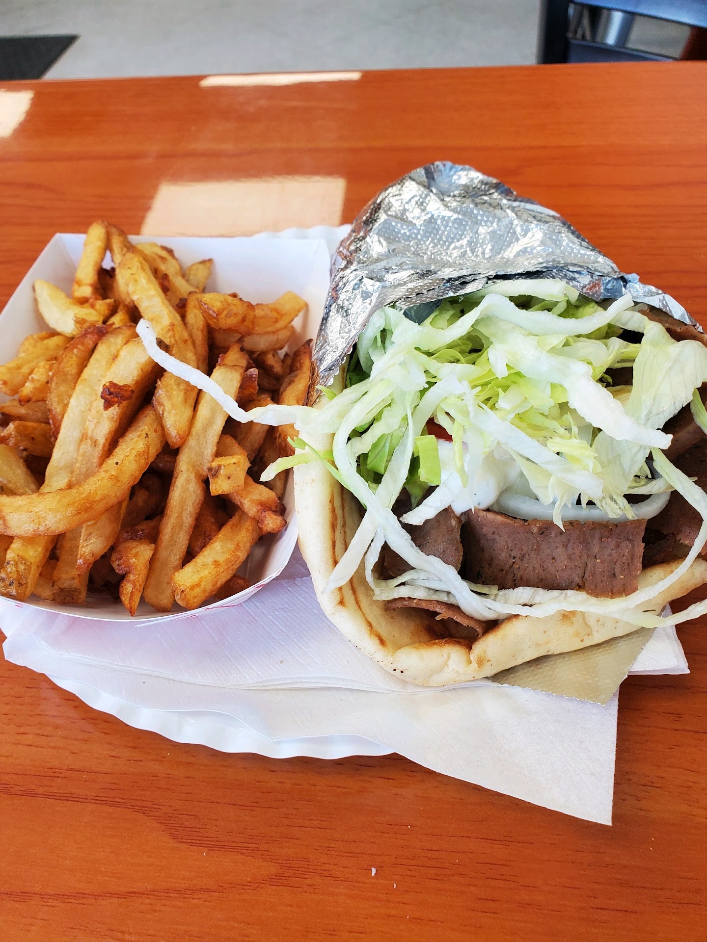 When my food was delivered, it was piping hot and fresh. The fresh cut fries were just the way I like them, but they did not salt them, and I did not see salt packets or a shaker on the table. There was some sort of spice shaker there and I tried it, but I think it was paprika. The gyro itself was a nice portion and had shredded lettuce, onions, and some sort of creamy dressing on it. I would have preferred a stronger flavored creamy dressing, but that's not their style apparently.