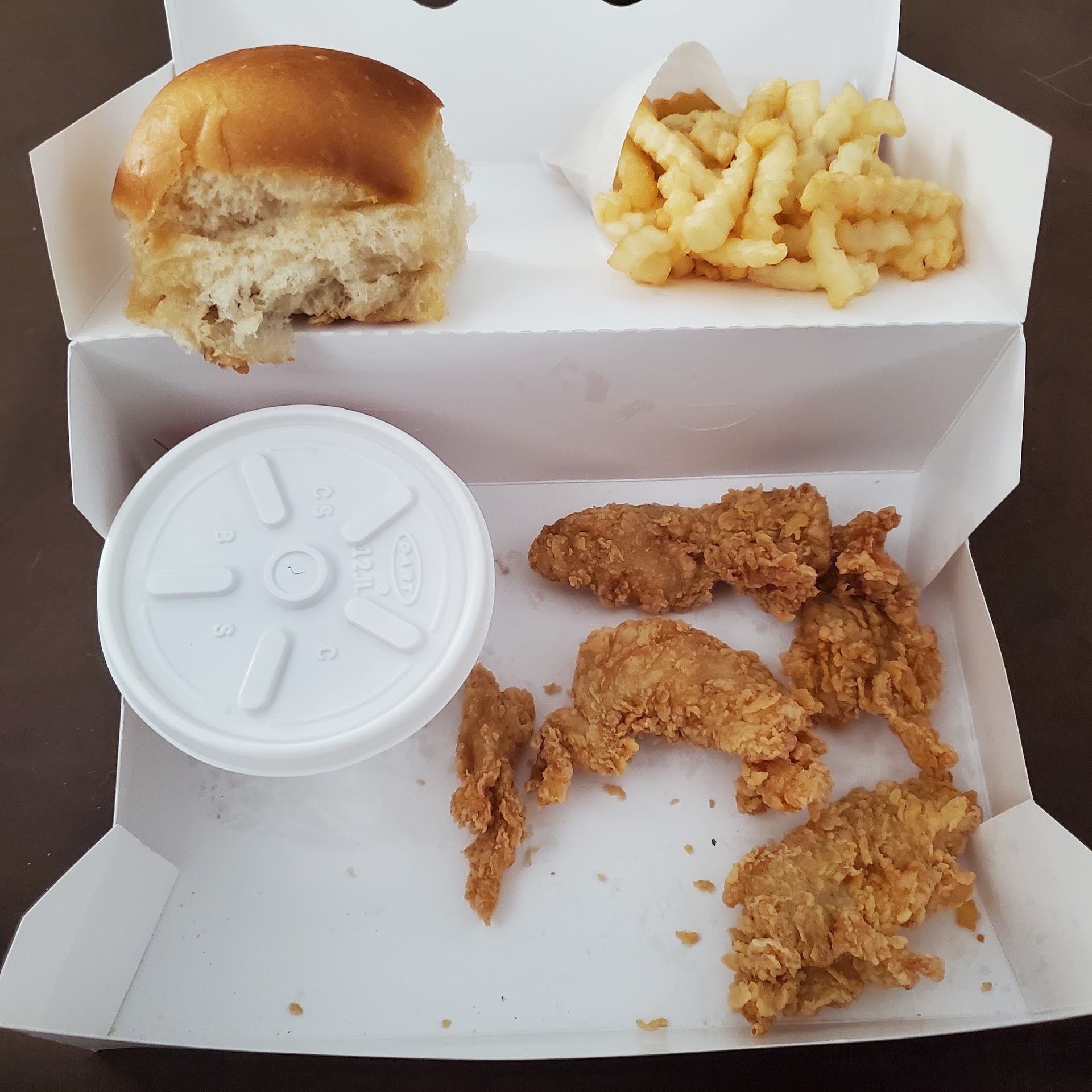 The same young lady then brought us our food and politely asked if we needed anything and my wife asked for hot sauce, she hurried away and came back with a handful of hot sauce! Looking at the chicken I was worried cause it was a light color but when we took our first bite my tenders were juicy and crispy! I asked my wife and she said her drum was juicy and crispy as well! I also ordered fries which were crispy and soft in the center! My wife got some mashed taters which weren't great it was like like a block of potato but with the gravy she tore them up!