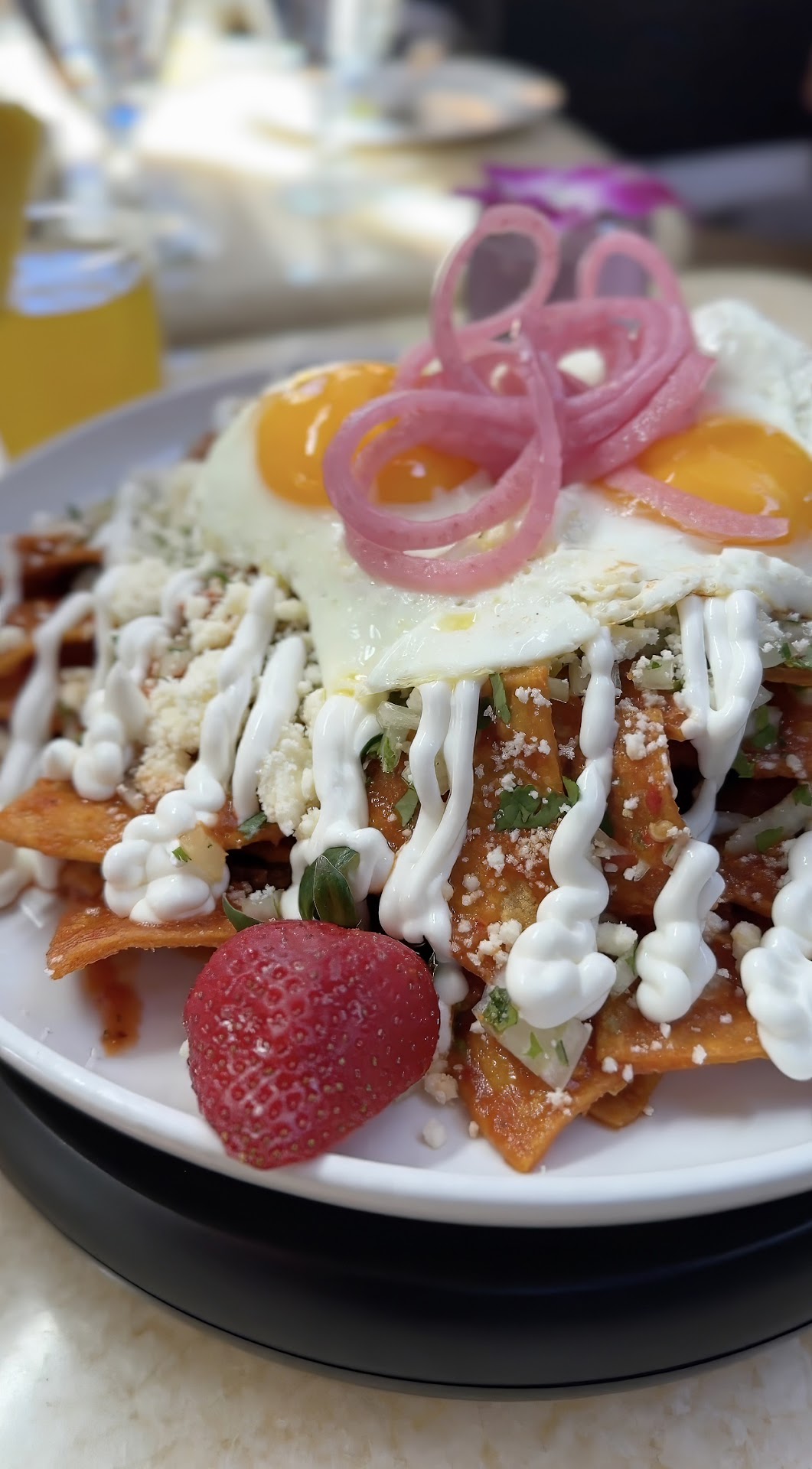🌶 Red Chilaquiles – A perfectly spiced take on a brunch classic. Fresh tortilla chips are smothered in a bold red salsa, crema, cilantro, onion, and queso fresco, then topped with two eggs and pickled onions. Every bite packed that perfect blend of spicy and savory.