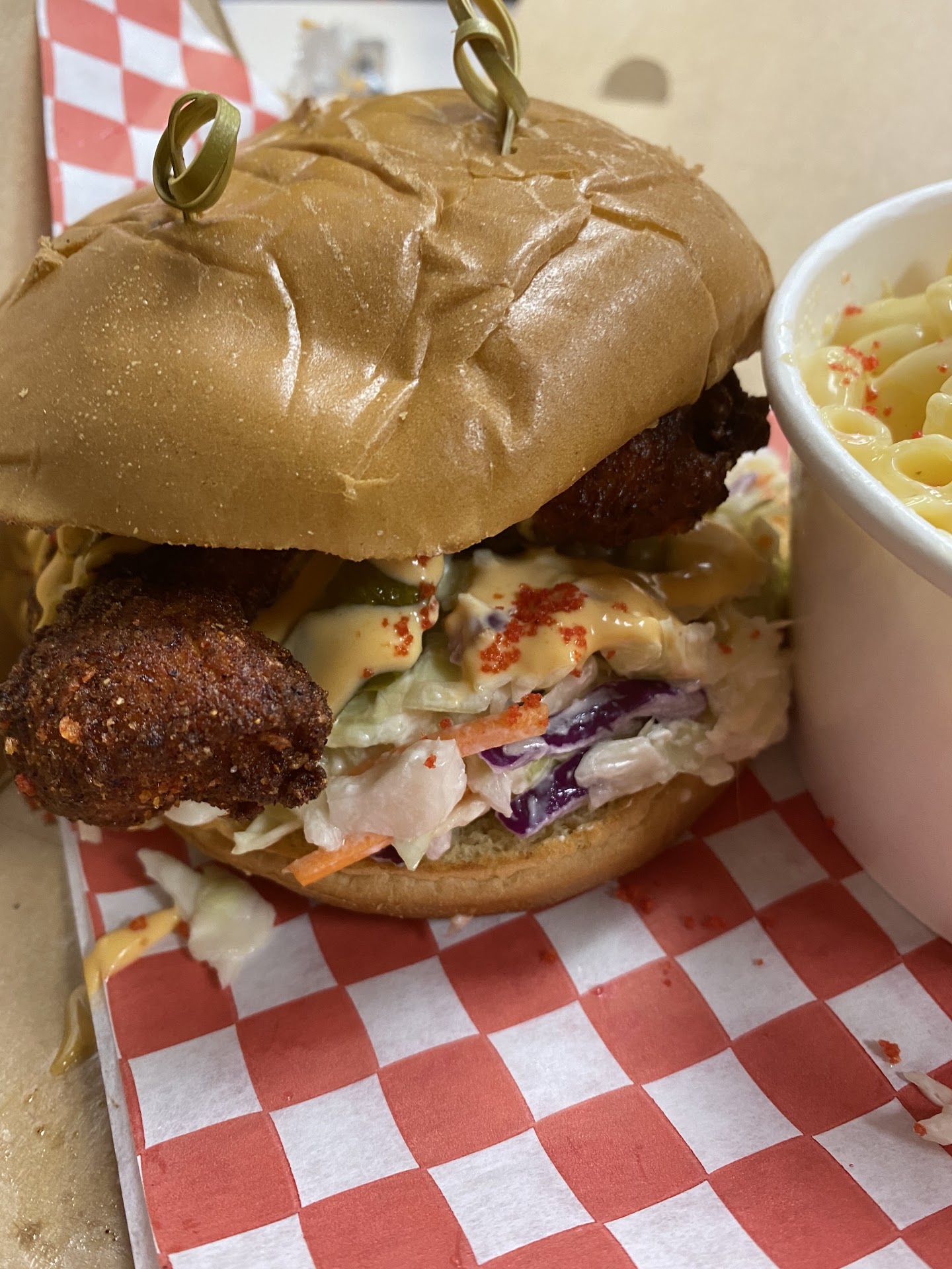 Their sandwiches are absolutely heavenly. The buns are high quality, warm, and delicious. They come with coleslaw, pickles, sauce, and a chicken tender (or multiple!) fried in peanut oil and dusted with Cheeto flakes.