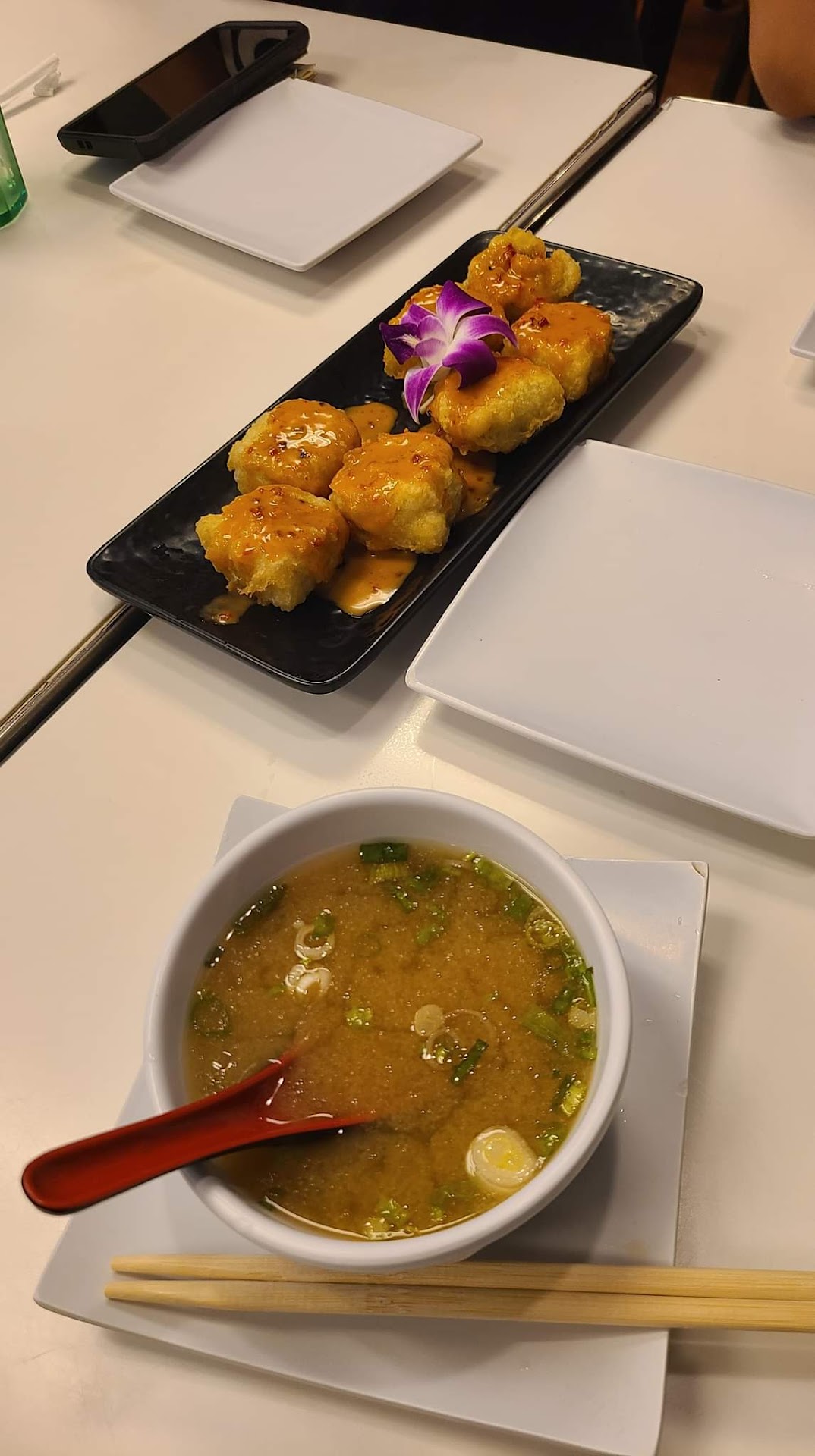Read moreGreat place and staff. Everyone were super friendly and courteous. We got seated pretty quickly being it was a full house. Ambience felt comfy and home-y for my group to the point that we over stayed a bit after they closed. We ordered the #1 bento box, popcorn lobster (I think that's what's called), and two appetizers (gyoza and calamari) and we didn't know how to finish it. The bento was huge and we split it 3 ways with our appetizers and lobster meal that were also a great amount. Great food and would totally recommend this place to anyone who loves sushi. Picture 1: miso soup that comes with the bento box and a comp sushi plate that they gave us Picture 2: popcorn lobster with it's sushi rolls underneath and yes the orchid flowers are edible :)