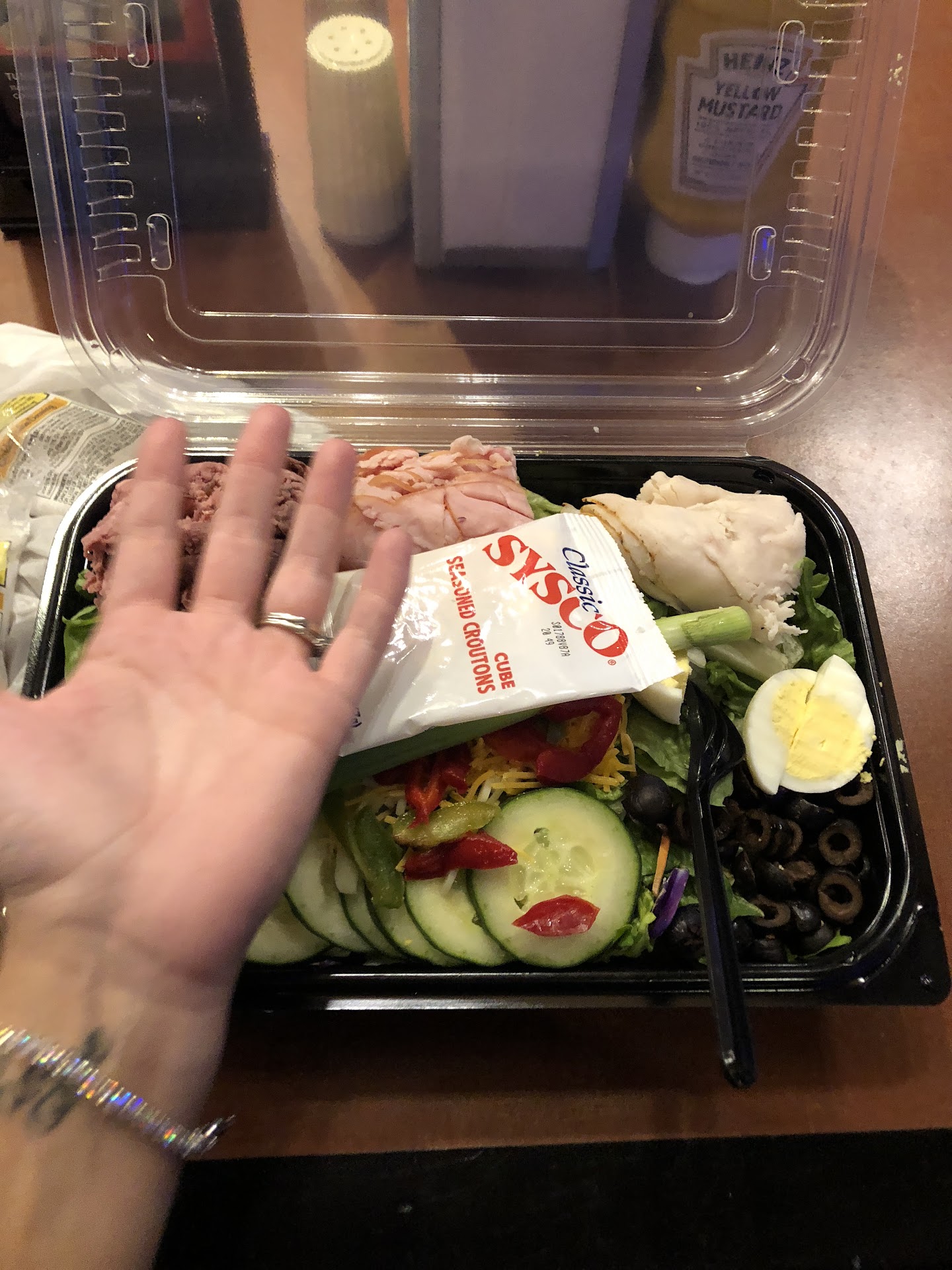 I ordered a chef salad, I am not kidding you, this salad could feed 4 people. 3 generous portions of roast beef, turkey and chicken deli meat. 2 kinda of cheese- Swiss and cheddar. 2 quartered boiled eggs, and it comes with 3 large packages of salad dressing. My only complaint on the salad is that the eggs were over a day old. The almost tasted freezer burnt, or how can I explain this better- like they had been left in the refrigerator uncovered?