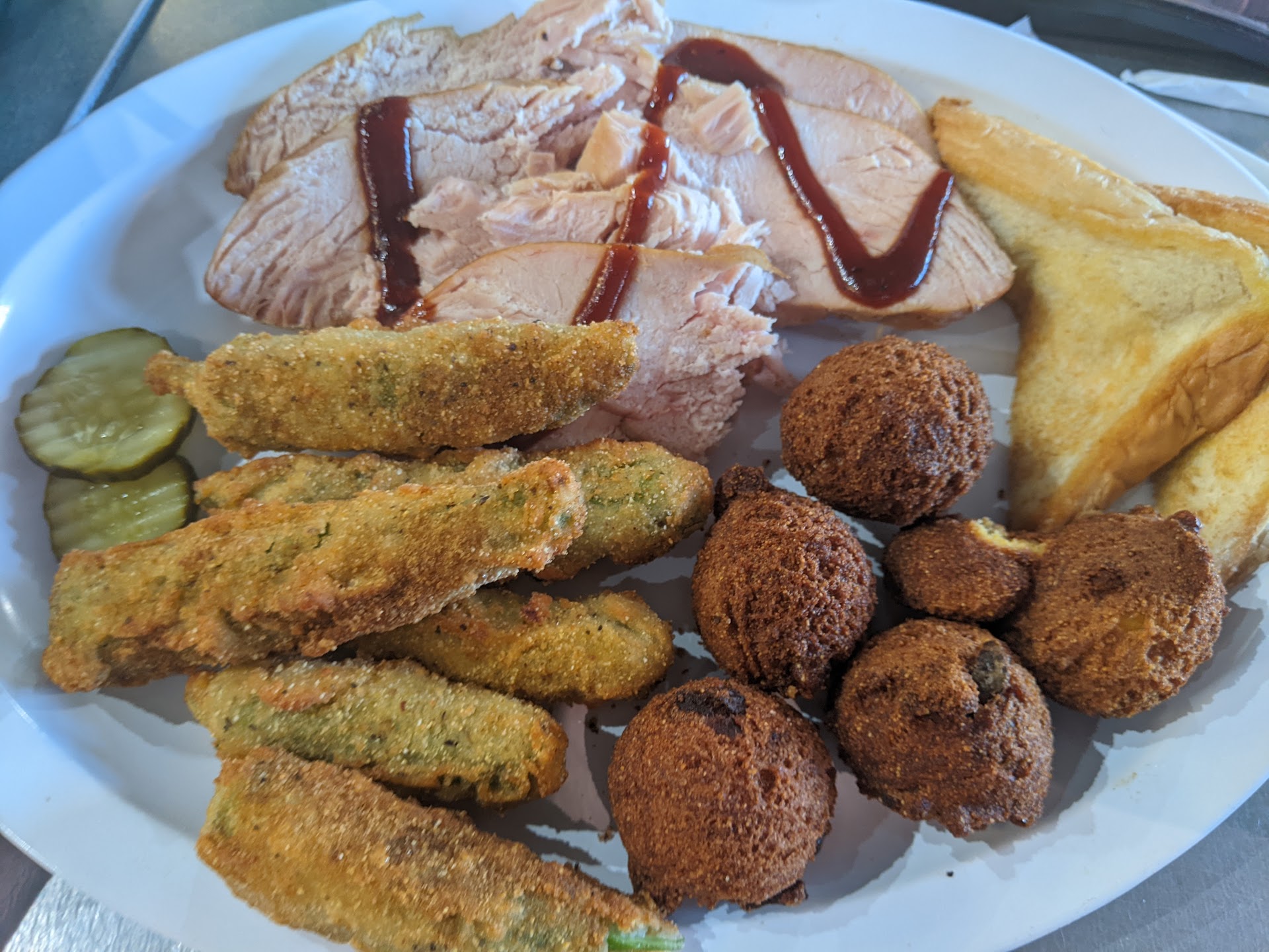 Read moreI wasn't impressed with this location. My visit was on Sat, March 26, between 11:30-12:00. The food and service are both, incredibly better at the BA location in my opinion. I purchased the Grand Champion platter, that has multiple meats and sides. The flavor of the brisket and pork were not good, both were dry, the hot link had little flavor, but it WAS 🔥 HOT, they must have been out of sausage because all I got was hot link. I requested ribs in place of turkey and they were EXTREMELY tough, which I have never had happen, from the other location. The bologna was AMAZING! The okra had great flavor but it was not crisp at all. Next time I will return to the Broken Arrow location. MUCH of this order was discarded, due to lack of flavor or being tough/dry and okra was not crisp and I don't like wasting money that way. I get the platter and eat for several days typically. The location was prompt and service was courteous it just was not friendly as it is at the BA location. The location was clean, it appeared to be busy, as one would expect for the lunch time hour. I did notice they seemed to have trouble keeping track of where orders needed to go when they came out as well as what sides needed to go with which order as they prepped them, as if it lacked organization in the back. Hopefully it will improve and become a better location or perhaps they just had an off day, those do happen...