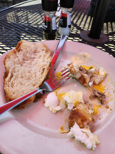 AUGUST 17. 2025 A friend and I chose this location for lunch, as the choices are limited in this area on Monday. Ordering went OK, but the small dining area was hot, and there were unsightly multiple air conditioning units plugged into the ceiling, that were not very effective. My friend ordered the chicken salad croissant, which held wilted lettuce on the sandwich and as garnish. There was only less than a tablespoon of chicken salad on each half of her sandwich. She took it back to the cashier, and waited a considerable period of time before a freshly made, more vibrant sandwich was brought. She deemed the chicken salad good. I ordered eggs Benedict on a croissant. The sandwich had Canadian bacon, with two poached eggs covered with a light hollandaise. The top of the untoasted croissant was placed on the plate to make the plate look fuller, withn the same sprig of that wilted lettuce. I noted all sides were expensive a la cart, and have not been way in the past. The egg/ hollandaise flavor was light, and the saltiness of the bacon was most prominent. I don't think I'd order it again. Both dishes were a poor value considering the food received. This visit was sub par based on my previous visits. We left a very poor tip, based on the self service nature of this restaurant, the atmosphere, and the low food quality.