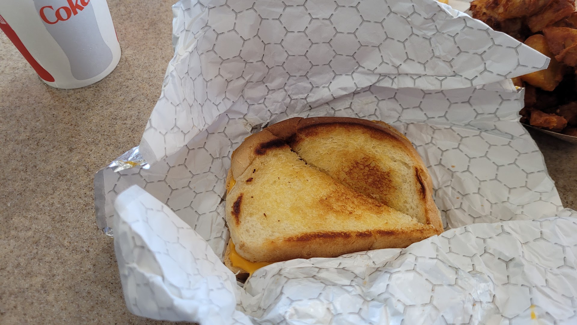 I ordered a double cheeseburger, and my wife got fish and chips. The fish and chips weren't that great at all. My wife ended up going to the counter to get a burger because she was disappointed with the fish and chips. I couldn't even finish one. It wasn't very good at all.