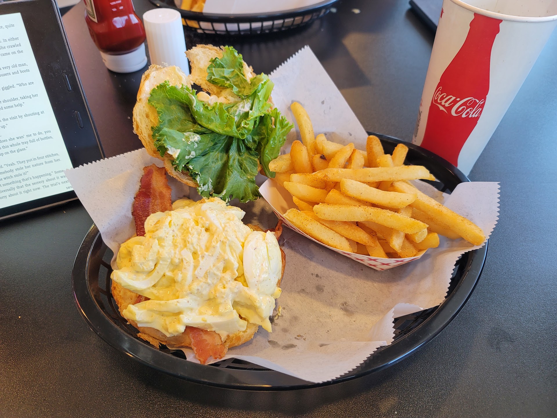 For our first choice ever, I got a Creek Egg Salad with a "Deli Twist." This came on a croissant with added pepper bacon and jalapeño mayo - that's the twist. My spouse ordered the Flaming Pit burger with its grilled jalapeños. We tried for the seasonal Watermelon Salad to share, but alas, it's not the season. The very full croissant sandwich was a challenge to eat, but full of flavor. My spouse's burger was likewise spicy and savory. It vanished before I wrote this line! We both approved the fries.