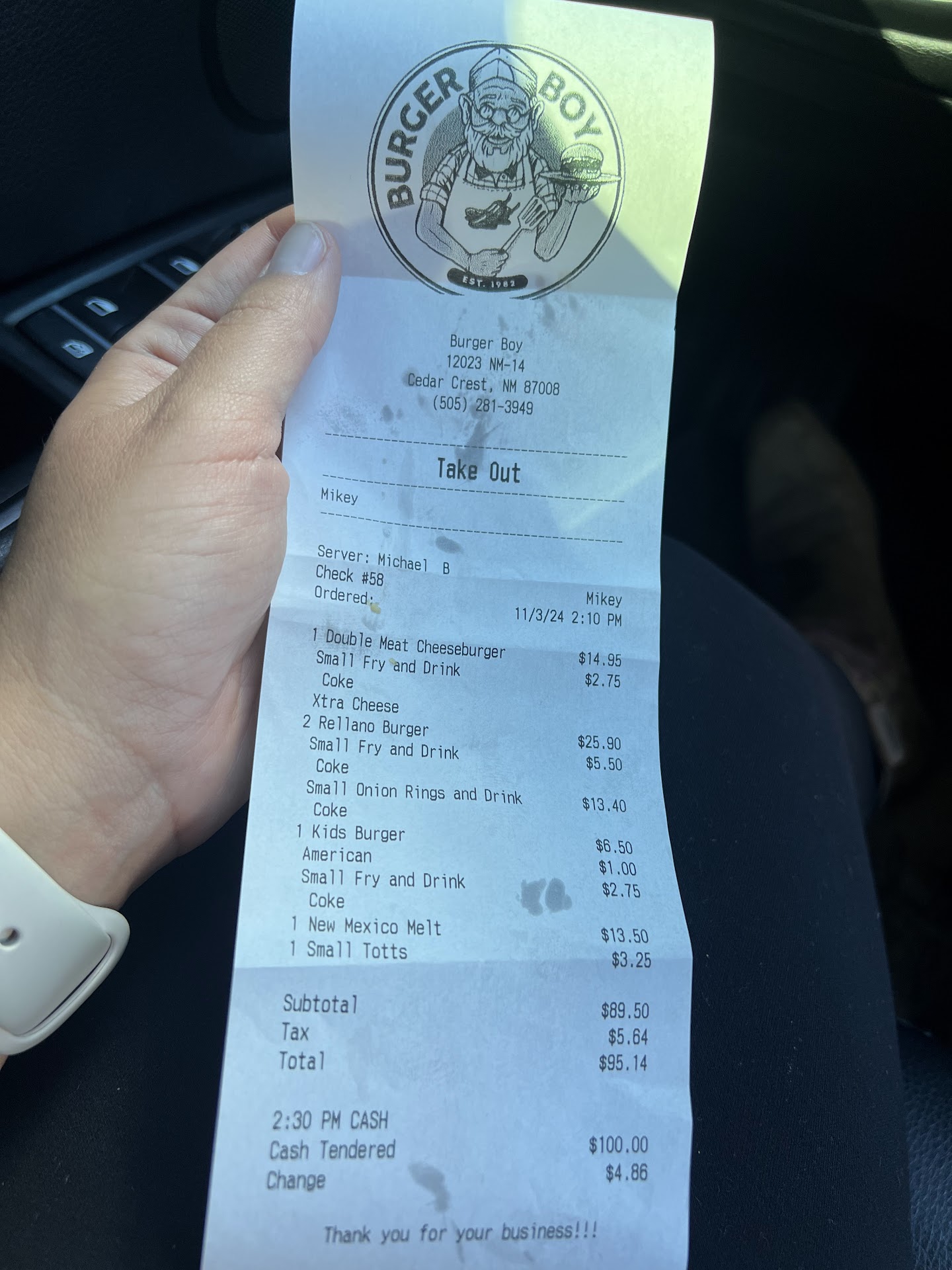 Read moreI had been coming here for a few years now. I have RAVED about this place to many many people. Well, maybe I just went on an âoffâ day? First, I tried calling to place an order since I was coming in from Albuquerque, the first and second time I called, the phone rang for about a minute then I got the operator. I tried again several times and it appeared the phone was taken off the hook (almost as if they didnât want to take calls). I showed up, there wasnât hardly anyone there, I let them know about the phone issue and the older gentleman just chuckled. They took my order & my wait was 20 minutes. I went to the drive through to pickup my food. I was a little shocked to find that my order was almost $100 for 5 burgers with 3 meals, 1 extra fries and 1 extra tater tot. Oh well, I paid it. Before leaving the parking lot, I checked my food bags. A French fry was missing so I went back to the drive through window. I let them know and asked for my receipt because I was already thinking this was too much. I got both and left back home. Upon arriving home, I noticed they threw the onion rings in a paper bag. That paperback seeped grease all over my front seat, it was not a sight to see and boy should I have taken a picture of this. Gross!! Anyways, I had the relleno burger, it had no taste. It wasnât seasoned at all and I was super disappointed in this. Everyone else seemed to enjoy their burgers. I was a little frustrated after the meal and so I looked at the receipt and goodness, I was absolutely overcharged! Again, I tried calling, phones still off the hook. Called the next day, it rang a few times and boom, phone was off the hook too. I finally gave up calling and Iâm not gonna drive out there just to complain. I may give them another chance down the road but I sure am disappointed at the service they have provided. -BEWARE: Make sure you check your receipt and food bag...