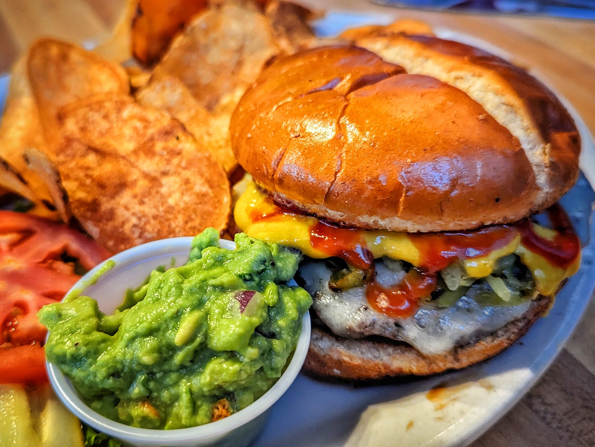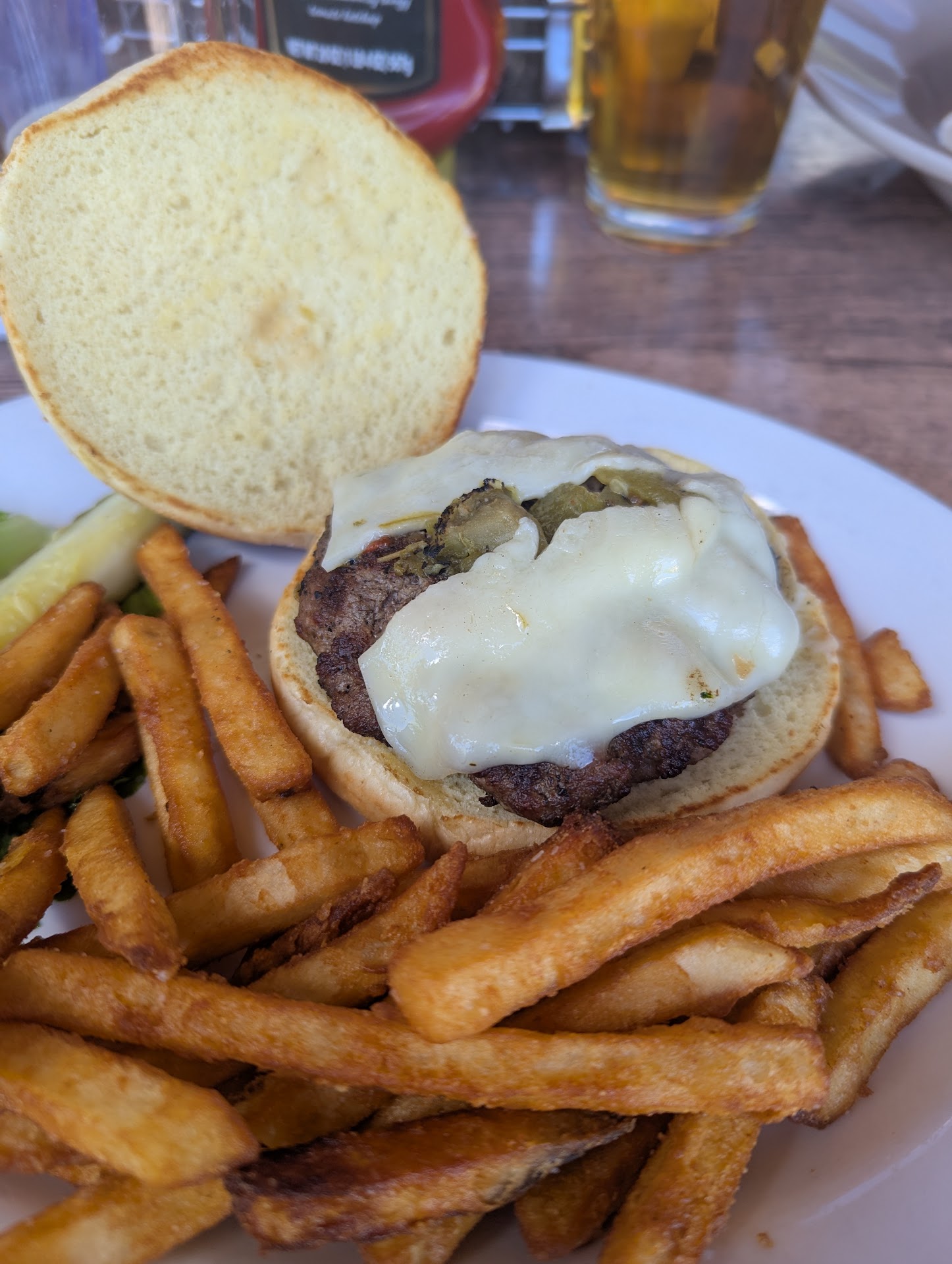 I was very pleased with the taste and choice of seasoning. Everything is well balanced and I didn't notice overpowering flavors, including the green chili. it's a very good burger... I asked for a medium texture but ended up getting well-done. The house-made potato chips are very delicious - light, crunchy, and perfect with a burger.