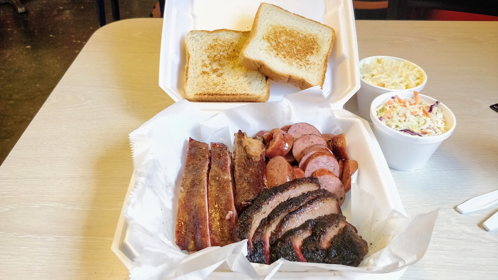 Read moreSold raw ribs. Bland greasy meat. 2nd time here. First time they were out of everything except brisket. So I ordered a sliced brisket sandwich. I remember it being fair to middling. Not bad and not good enough to go out of my way to eat here. Happened to be in the area for work, tried it again early Saturday. Unfortunately, everything was available and I ordered ribs, brisket, and sides. Wish they had been out. Will not return. Greasy, fatty, TOUGH, bland, RAW ribs. I posted pictures of the pink. (not smoked pink but raw food pink) Very disappointing. They may be friendly but not efficient. No reason to wait 15 minutes and then deliver an inedible product. Large portions for a decent price. 2 can eat off 1 plate IF the food was seasoned and meat cooked thoroughly. The sides were all canned so no risk of not being done, they were just warmed and scooped. Made a $20 donation to the restaurant for the trash bin to consume. Eat at your own risk and if you think this is a good BBQ, explore a...