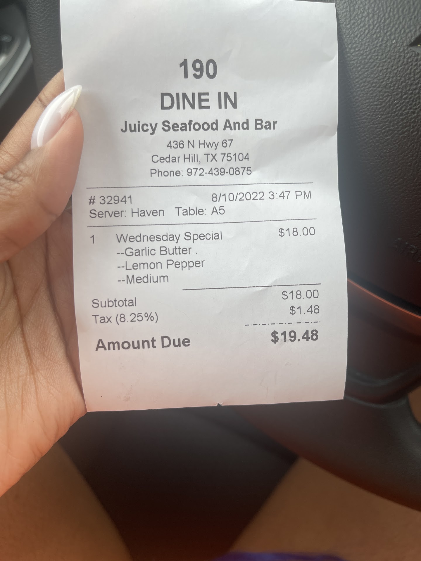 Read moreI visited this place last week with my niece. The food and service was great. I didn't like the no substitution nor the only way to get head on shrimp is to but it separately but I love seafood specifically crab legs đ¤Ł. I normally go to Red Claw it's my favorite!! But my niece stayed close to this area so she chose this spot. The flavor was great. However I do prefer my boil to be soaked in its sauces. We asked the waitress could we get some more seafood boil sauce because it was just too dry. She replied yes and it would be 3.99 for a bowl. I told her it wasn't a problem and she could bring it right out. After that we were fine. We even purchased some sauce to go. Now to my one star review. I like the flavor of the sauce and wanted to come in and buy some more. When I entered I asked the gentleman at the bar what I wanted to purchase (the sauce). He's response to that was. We don't sale the sauce by itself. I told him that was odd because I was just in here last week and purchased two to go. He said do you recall your servers name. I told him no but did remember thr price I paid. He said oh okay. Yeah.. Well we don't normally sale the sauce by itself. My response was may I speak with someone else because I know that you do. It was listed on my ticket with the charge. He said uhh... will you have to buy a pound of something in order to get the sauce... I was still a bit off because I wasn't told that the last time. I asked him could he ask someone. He went to the back and in less than half of a second he came right back out and said no.. the chef said we don't sale it. I was like oh.. I didn't know the cook makes the decision. Thank you and walked out. They will never get my business again solely because of that. Red Claw...