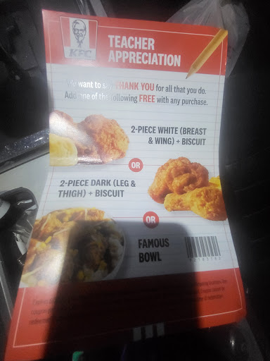 Read moreThis place is terrible!!! First no one in that place has any kind of cover for there hair but they have a kid with dreds making your food. Also the chick in the window acted as if I was bothering her because she was so in to her text message and running her mouth to her co-workers. Then the person who was in the drive thru in front of me stopped to take her food back because her was wrong after she had already waited a good 10 min for her food, why is it that the manager who I might add looked very very gross ( personal hygiene YUCK....) The manager comes over by the window with that lady's chicken in her hand (no cloves) swinging the chicken leg saying("now this lady's is complaining she didn't get no wings").. the kid who made the order response was ("she lien").. they threw some chicken wings in her box and gave her the same food. I got home and I got a $3 spicy famous bowl and it was SOSO sloppy and greasy I had a whole in my bag it was just nasty. This is the worse KFC I have ever went to. You couldn't pay me to go back here. They need to fire every person who was working on 1/17/2019 around 715 pm. Im tellin you folks you are playing with your health and possibly your life eating at this...