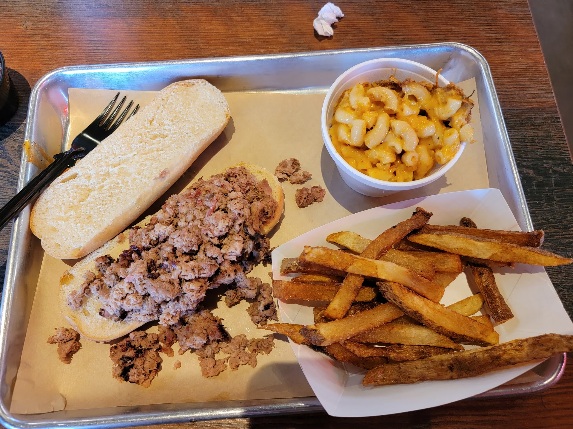 Ā Ā Ā Read moreThis place should have a wait to get food. Everything about it is good as a former truck driver this a place I would go out of route to eat at any time I could. The atmosphere is southern and enjoyable (the music is live radio maybe a playlist would work better but perfect volume) like that dinner you went to a kid with that comfort food. Service is great the people working at the front talked to me and made me feel like a regular even mentioned how they ate the desserts and other neat ideas. Place is cleaned and maintained well. I take it the āold manā is the boss here or even owner but you canāt tell because heās grinding away alongside everyone else. My respects for that because I donāt see that anymore and he seems more than happy to assist you and tell you about the meats and rest of the food. Then the food⦠it was great ! I canāt say more than that I wish I would have taken pictures before but once I got a taste I devoured it. The mac and cheese and ranch house beans is what I had and I will continue to have every time simply because they go perfect with bbq. I had a classic two meat plate ribs and sliced brisket and it was moist. I got back in line and got the double barrel potato with all the fixings for my wife and a chopped brisket and sausage sandwich for later. All I have images of is the results of what...
