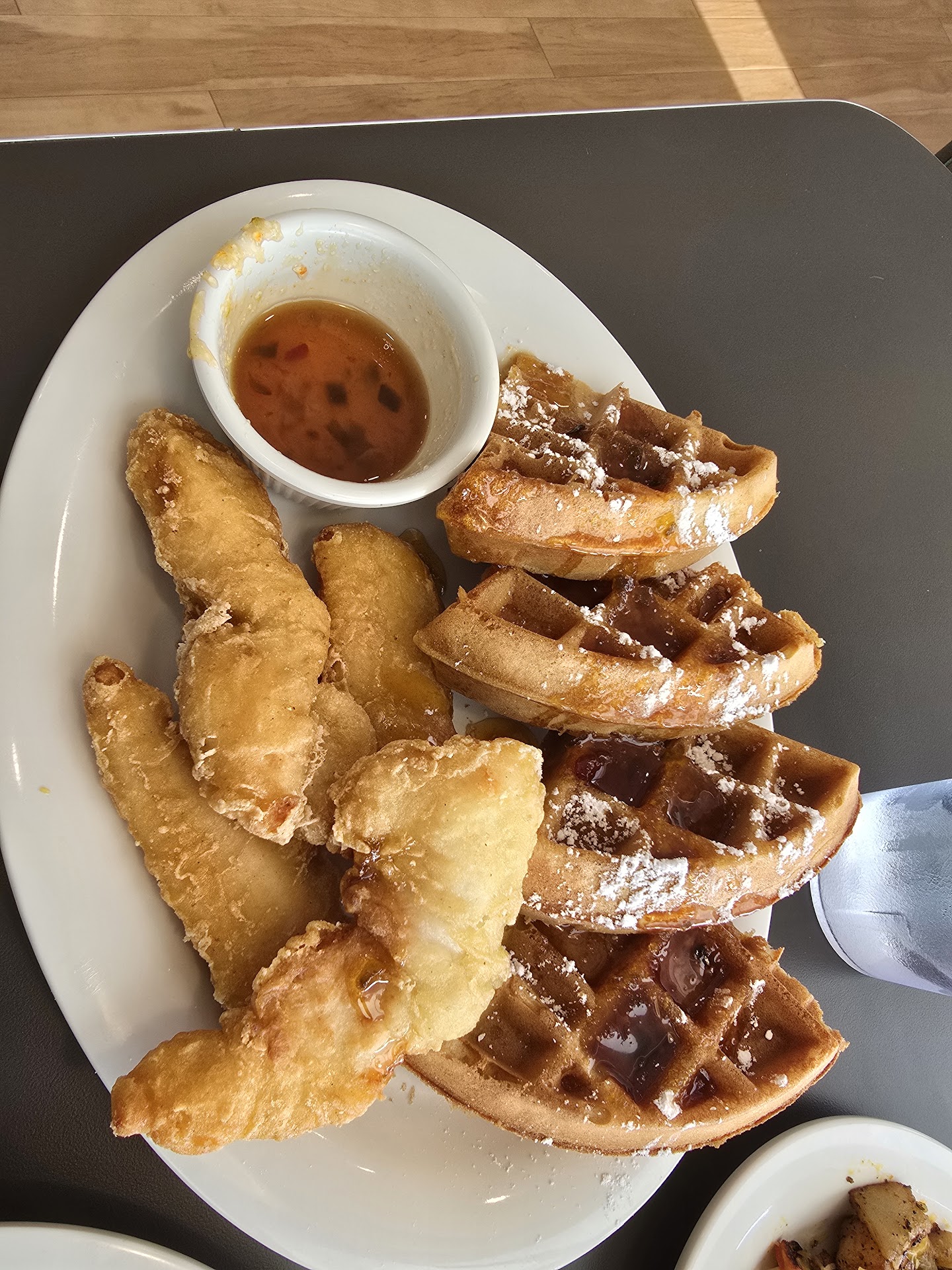 The place is really nice, upon entry your presented with a clean organized environment with an open airy dinning room , decor is modern and bright. Seating is comfortable and spacious. The service was a little strange, made me feel like a child for ordering chocolate milk. I ordered a good amount of food as I like to try a variety of things when at a new spot. The Chicken fried steak and eggs was not terrible, the eggs were cooked perfectly and the sausage gravy was delicious. The CFS itself is just a standard Ben E Keith or Sysco type CFS, it would be much better if homemade, the biscuit is a 10/10 delicious. The potatoes or home fries i believe they were called were good just dont add the jalapeños as they are outta a can not fresh so the taste from those kills the actual flavor of the spuds. Chicken and Waffles was similar, pre-made chicken tenders, and the waffles themselves were amazing, the spicy syrup is good as well, although IMO a little sour. I ordered the blueberry muffin but didn't get it so no review there. The cheesy grits were ok but needed a little more cheese as you couldn't quite taste it. All in all food was Hot, fresh, and out on the table in about 12 min. The Pineapple mimosa was decent but lacked Pineapple juice. The chocolate milk was standard Hershey syrup and wasn't very flavorful. All in all I will definitely give it another try. I would stick to fresh breakfast items though nothing breaded as they seem to be pre-made and lack flavor compared to the rest...