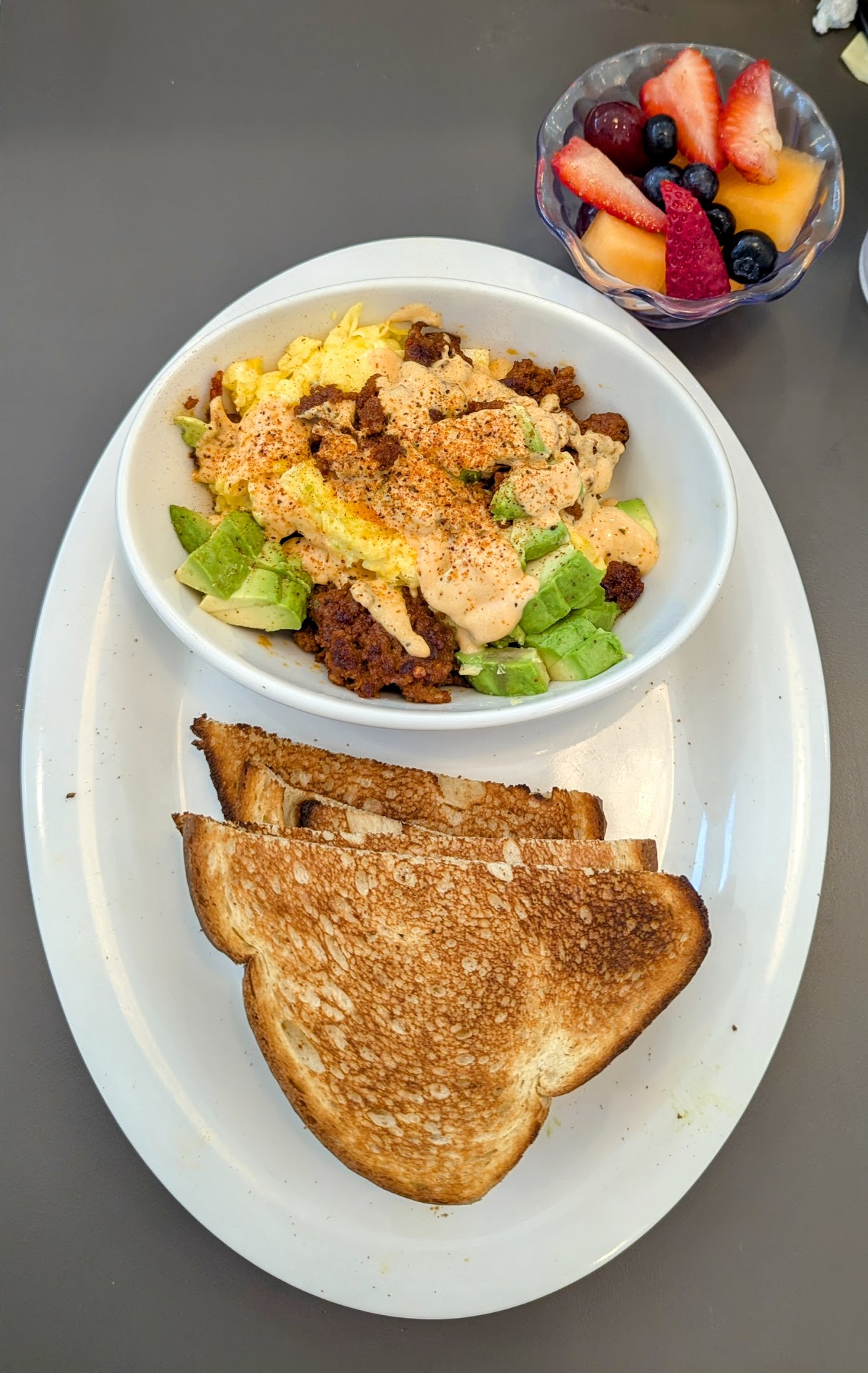 The food was absolutely bland and had weird textures. My partner ordered the chimi steak scramble and said it had no flavor at all. My Goodness Gracious omlette was flat, kind of slimy and had no flavor at all. It was topped with sliced tomatoes which must have been cold because my whole plate was barely room temperature. I got the plain grits and a side of sourdough toast. They were okay but I have had better everywhere.