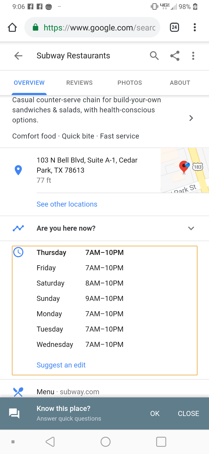 Read moreI went there today to pick my online order. Ordered two veggie patty sandwich! They didn’t have the patty , I wasn’t called to check if it’s ok to make a sandwich without it. My pick up time was 9:15 but I only went around 10:45 am to pick it up! The subway employee didn’t make my sandwich yet as they didn’t have the patty and wasn’t sure if I want one. So I go pick it up and she asks if she can make it without patty, I said yes and she finished it. At the end I ask her, will I get my difference back as veggie patty is more than delite. She says “no it’s the same price.” I said no it’s not. She was repeating the same. So I had to open my app and show her there is a $1 difference. She says “it’s just a dollar difference” and didn’t give me my money back or store credit or nothing! Yea $1 isn’t much and I can let go but that’s for me to decide not her! That wasn’t nice at all. I am not going back there...