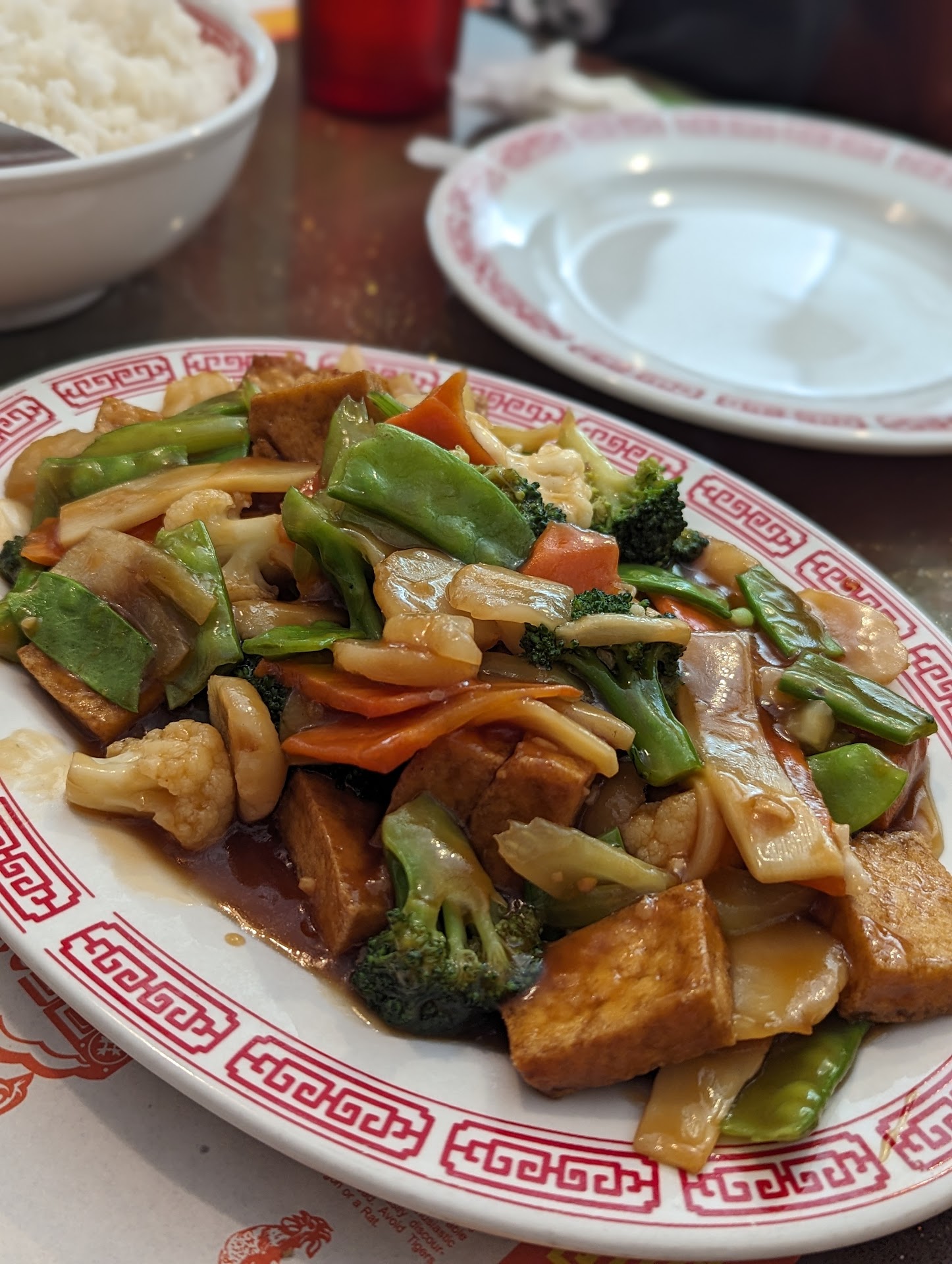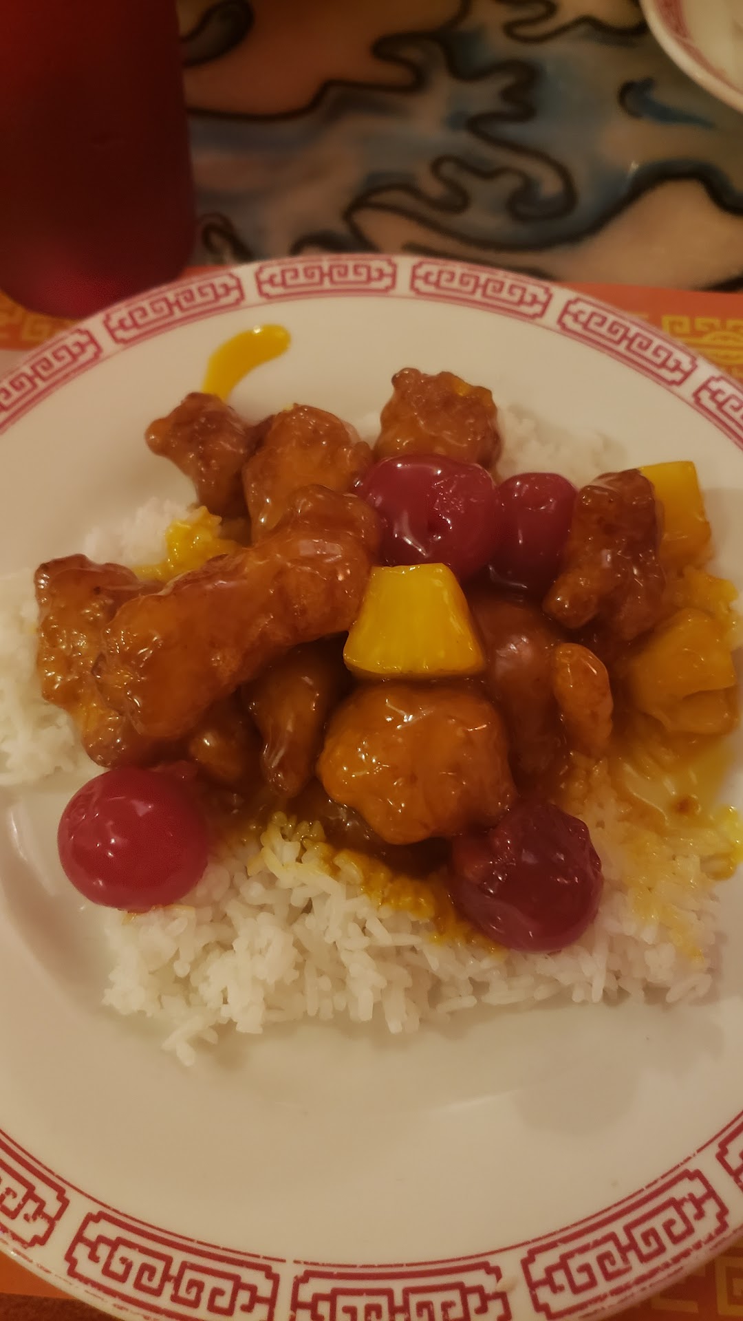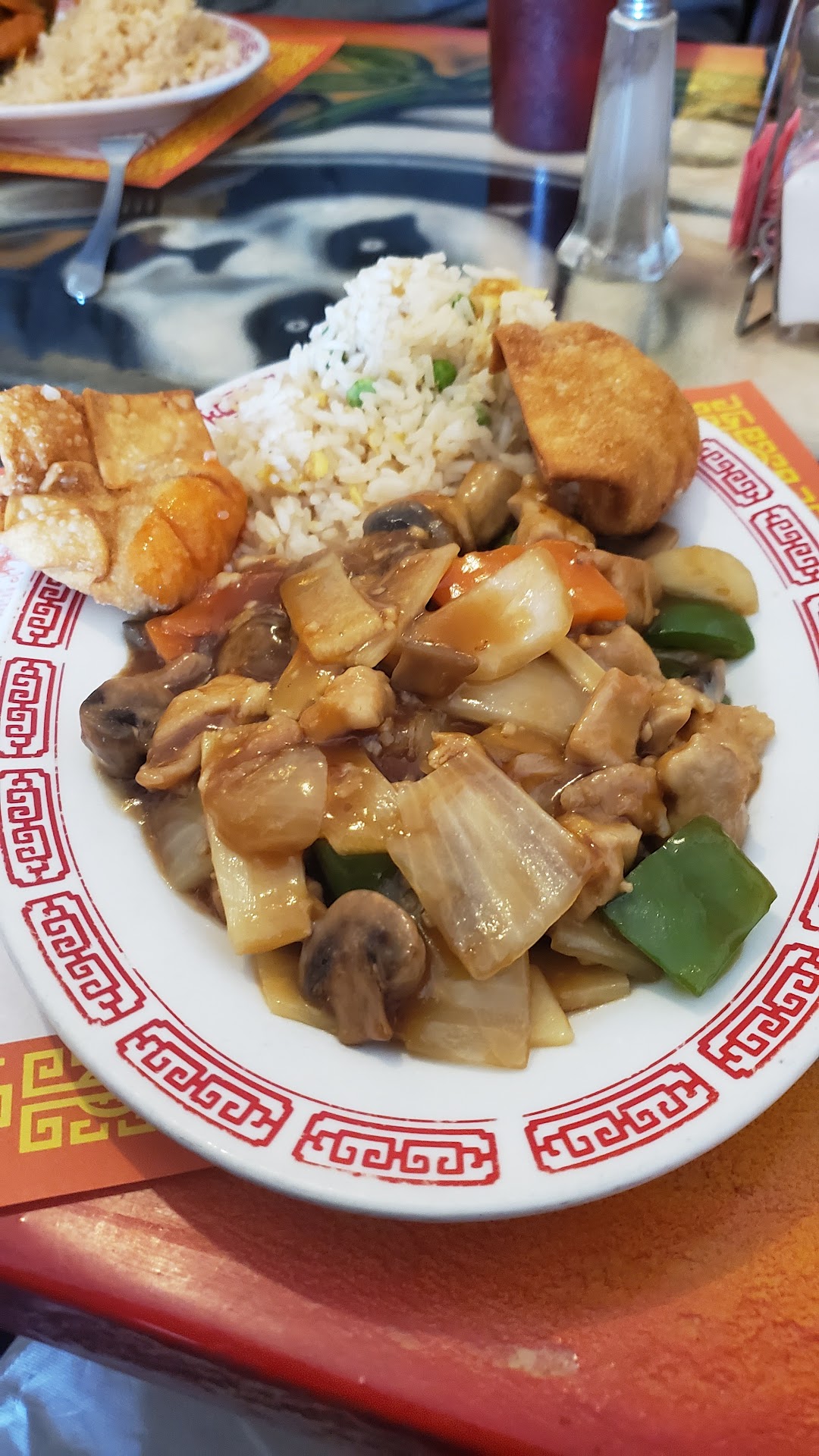 The dishes were all served with fried rice - no options were ever offered. None of us realized we'd ordered lunch specials until the soup came out. The lunch specials also came with crab rangoons. They were described as "probably okay for me to eat" because there didn't appear to be any crab in them. All the dishes were bland. There's was just nothing exciting about them. Nothing tasty, nothing super fresh, nothing but plate after plate of sad vegetables covered in sticky sauces. My nephew ordered the lemon chicken and it was just weird. Battered & fried balls of chicken (expected) with some pineapple chunks and cherries thrown in. Pretty sure that all came out of a can. And when an eight year old describes something as very sweet you know you've got a bad lemon dish on your hands.