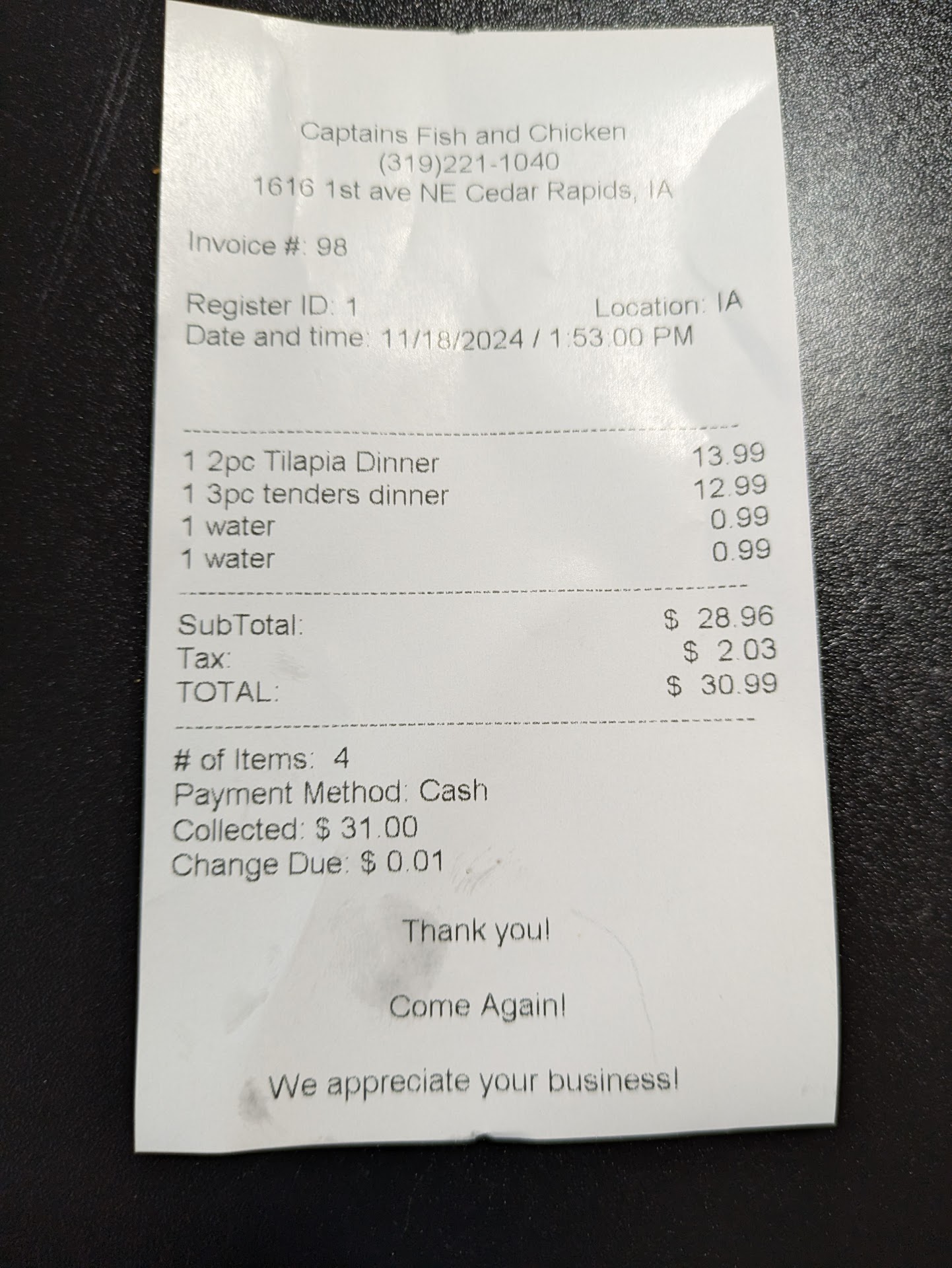 I was raised on the water on the East Coast. After moving to Cedar Rapids, Iowa some 19 years ago, I can truly say that it is hard to find a good piece of salt water fish. I can no longer say that because now we have Captain's Fish and Chicken. I have eaten here three times now and have had the fried grouper, the fried Cod and also the fried shrimp. this place brought me back home in many ways allow me break this down