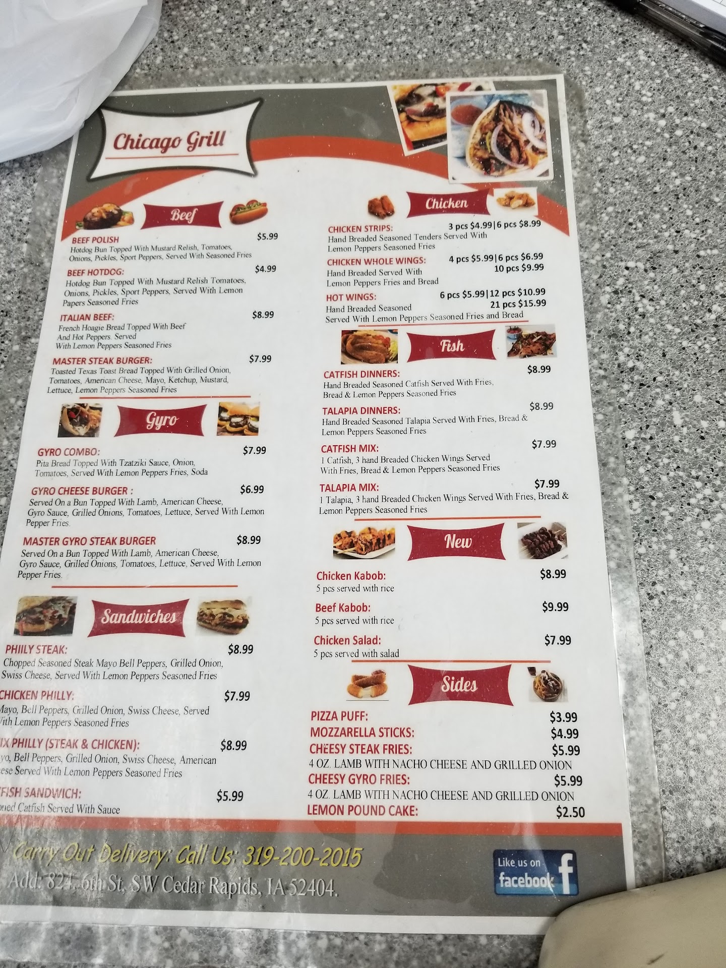 Read moreI am convinced the people that work here must have invisible wings. Bright lights in this well lit restaurant may be the first indication you've entered heaven. The menu here although small and simple has enough variety to tantalize just about anyone's taste buds. To find so many of my favorites listed it was difficult to make a decision. With the Shawarma broiler in clear sight and the gyro meat beckoning to me. I decided to get that combo meal. Friendly staff took my order and placed it on the line where in clear sight I could watch a very capable line cook prepare my order to perfection. There was barely enough time to check in on social media and update my status before my order was ready. A quick glance showed that the extra sauces I had asked for where in my bag. Now, all that was left is to race home so I can start enjoying my meal bite by tantalizing bite. And it did absolutely exceed expectations. Even after a drive my french fries were hot and crispy. And my gyro was absolutely delicious. A nice warm soft pita with the perfect combination of tzatziki sauce, lamb, tomatoes and, onions. I look forward to returning and trying every last item on the menu. With very friendly staff and incredible food Chicago Grill is indeed heavenly. I highly recommend Chicago Grill as your next stop for some of the best takeaway food I...
