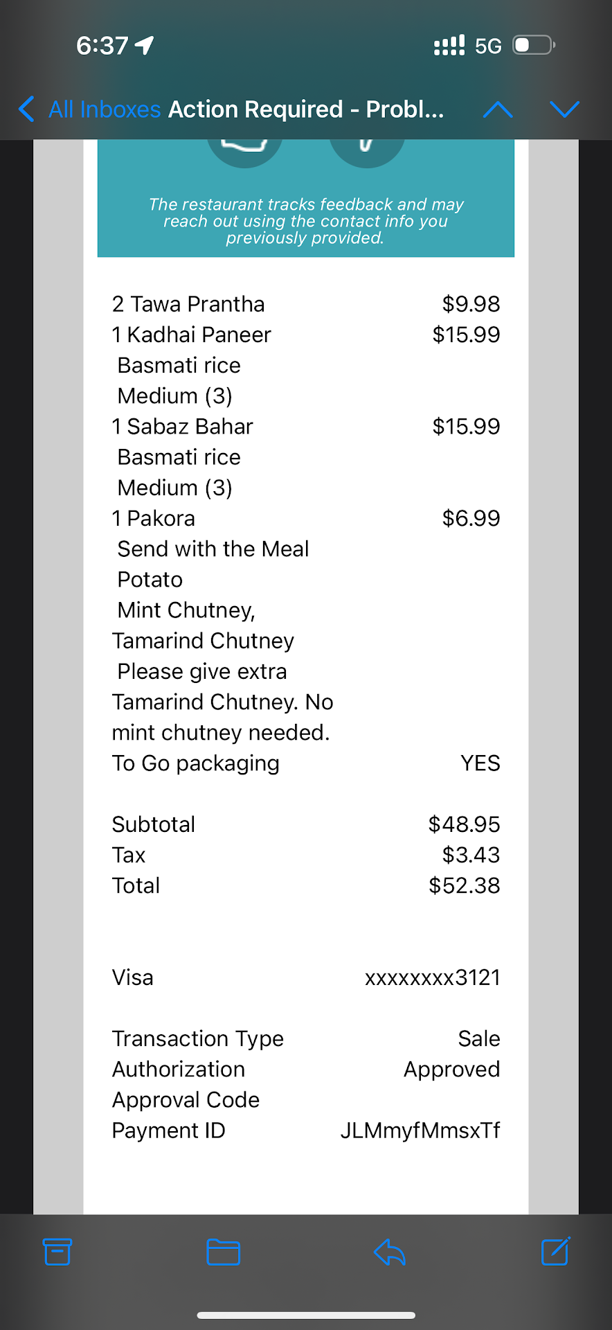 When I asked for a refund, the same lady had the audacity to say, “We’ll look into that tomorrow and issue the refund in 48 hours.” Excuse me?! You took my money instantly, failed to provide the food, and now you’re making me wait two more days for a refund? Absolutely unacceptable.