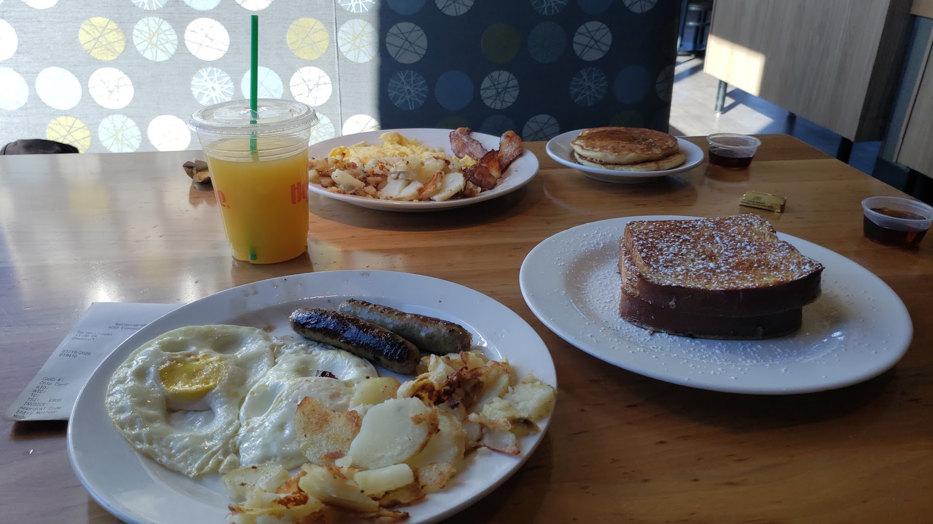 I went here last weekend with my boyfriend for breakfast, the seating area wasn't very clean but we found a booth that was okay. Our food didn't take long because we called ahead, and when we went to grab silverware all of the forks were dirty. My boyfriend asked the staff in the back if they could wash two of the forks for us and after a long wait they refilled the entire fork bin and somehow they were all dirtier than before! There were chunks of food inbetween every prong and the knives also had heavy residue on them and they were dripping wet. During all of this our server was nowhere to be found and we ended up getting plastic single-use cutlery from the dispenser outside of the seating area. By then the food was lukewarm and potatoes had gone cold, the taste was fine but mediocre overall and my boyfriend and I both decided not to dine-in if we ever wanted breakfast from...