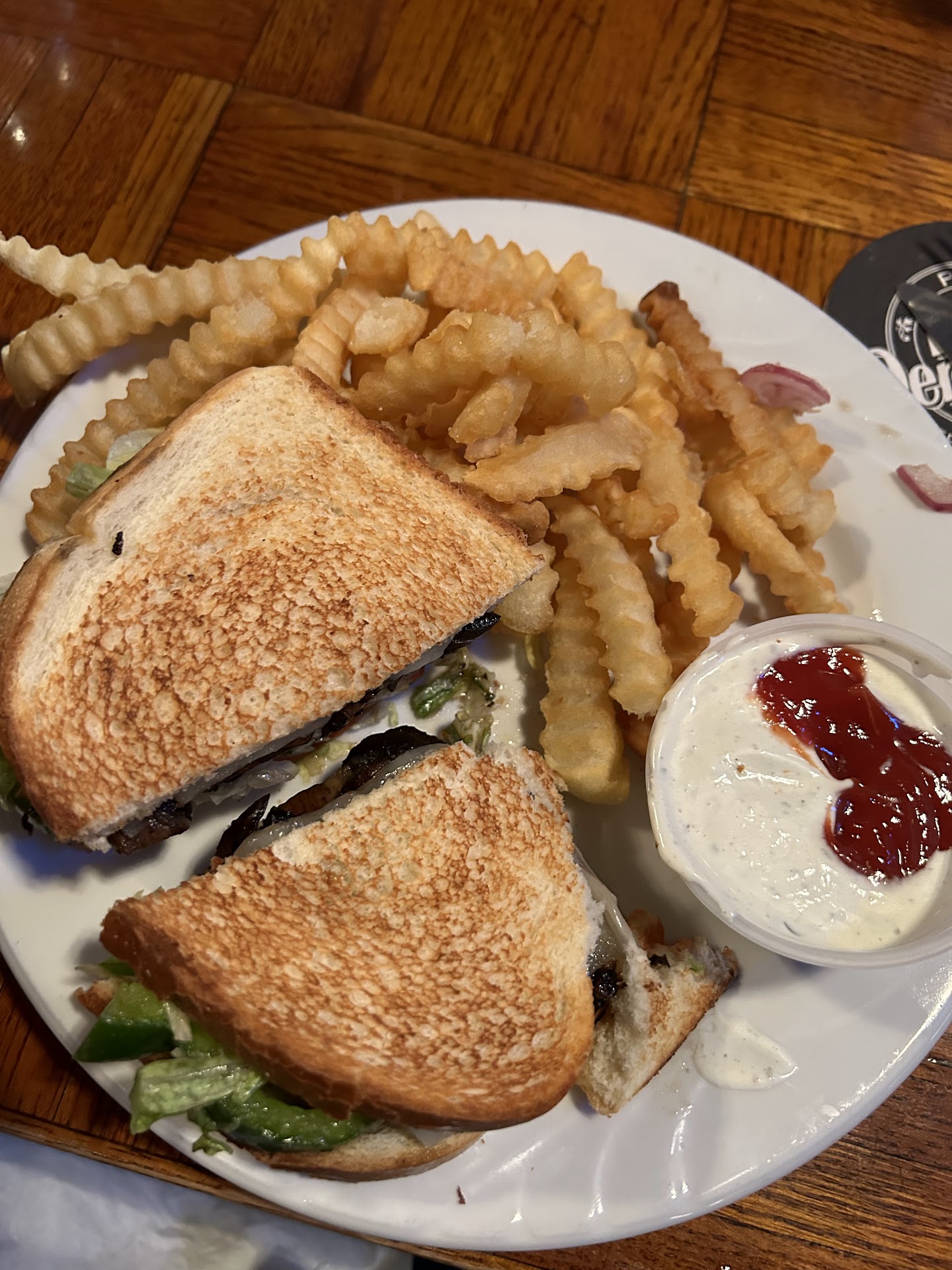 The mushroom was nicely grilled. The rest of the sandwich didn’t make sense after I began eating flavor wise. I asked to skip the cream cheese. That was a weird topping. The ranch was good on the side.