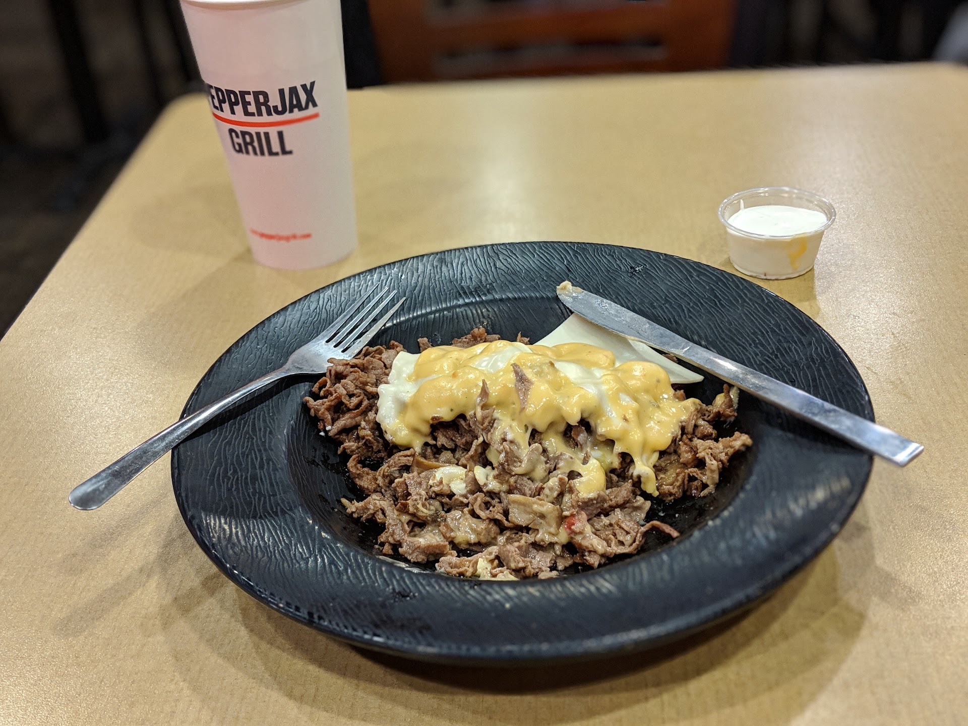 Read moreChecked out Pepper Jax tonight after listening to my co-worker rave about it a couple of weeks ago. And in all honesty, I give the food a solid 3 stars on taste. The other star is for Callie (sorry if I've misspelled her name) - whose customer service won me over the moment she greated me. I just knew that the food was going to be amazing and everything Brittany had said it was, and based on Callie's suggestions I ordered a philly cheese steak with onions and mushrooms and extra cheese (extra sliced cheese doesn't cost extra, FYI), cheese fries with the pepper jack, and I helped myself to a couple small ramekins of the mushroom sauce. I'm glad I did because it was delicious with the fries, and I wasn't a big fan of the pepper jack cheese sauce. It had a sweetness to it and I don't care for sweet and spicy together. The sandwich was good, but it was a bit salty, as were the fries. My lips are still burning a little from all the salt, and I'll probably get up to pee like three times tonight. I'm not gonna lie, I ate it all...every fry and both meatless ends of the bread crust, but not the cheese sauce. Again, glad I got the mushroom sauce, which Callie did an awesome job of describing all of the sauces to me when I asked about them. I couldn't resist adding a rice crispy bar treat to the bag, which I'll probably take to work with me tomorrow.