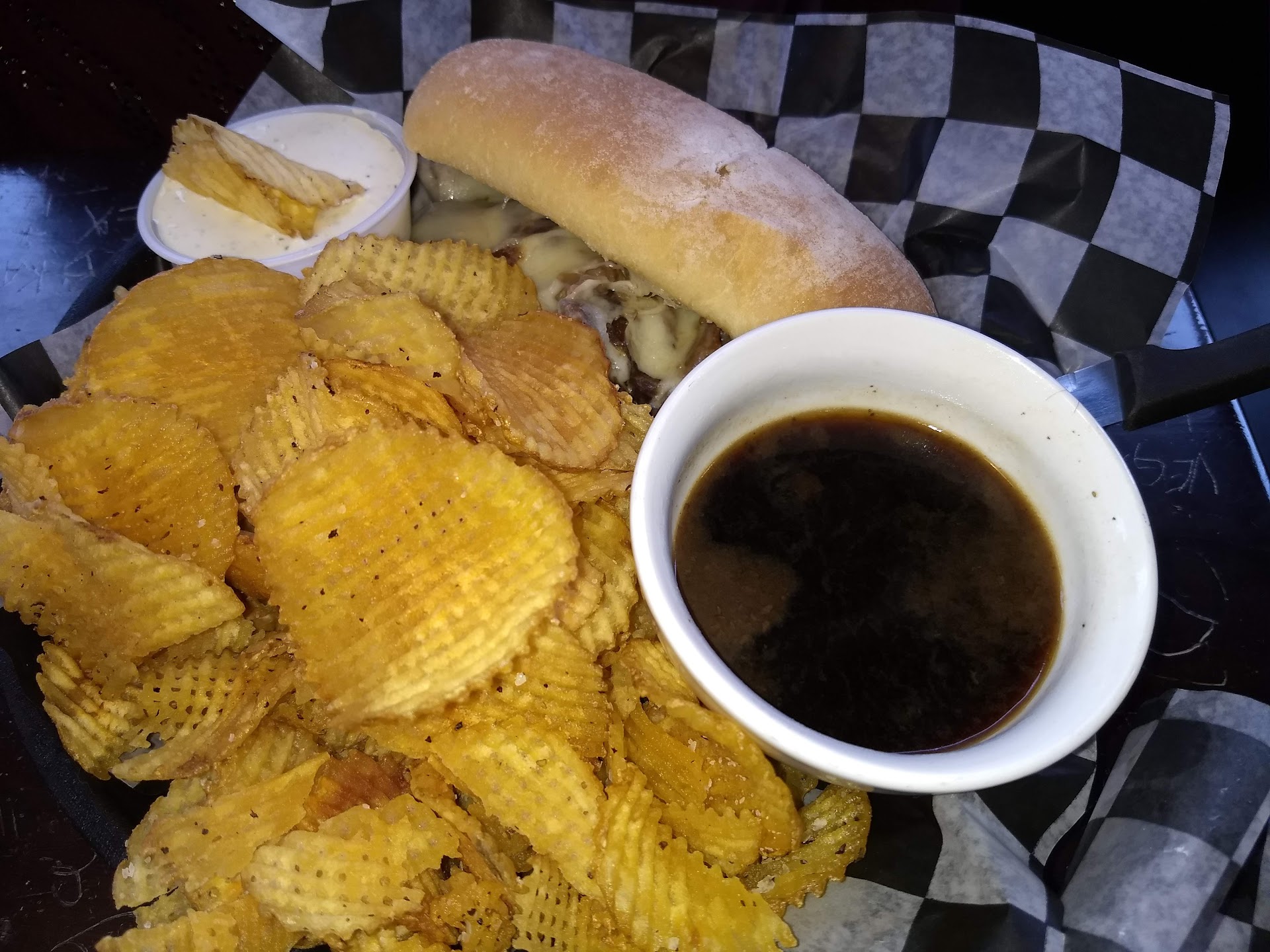 My friend enjoyed the "French Dip" with home made chips and she LOVED the chips! I enjoyed quite a few myself. They are cut waffle style but very thin (see attached picture).