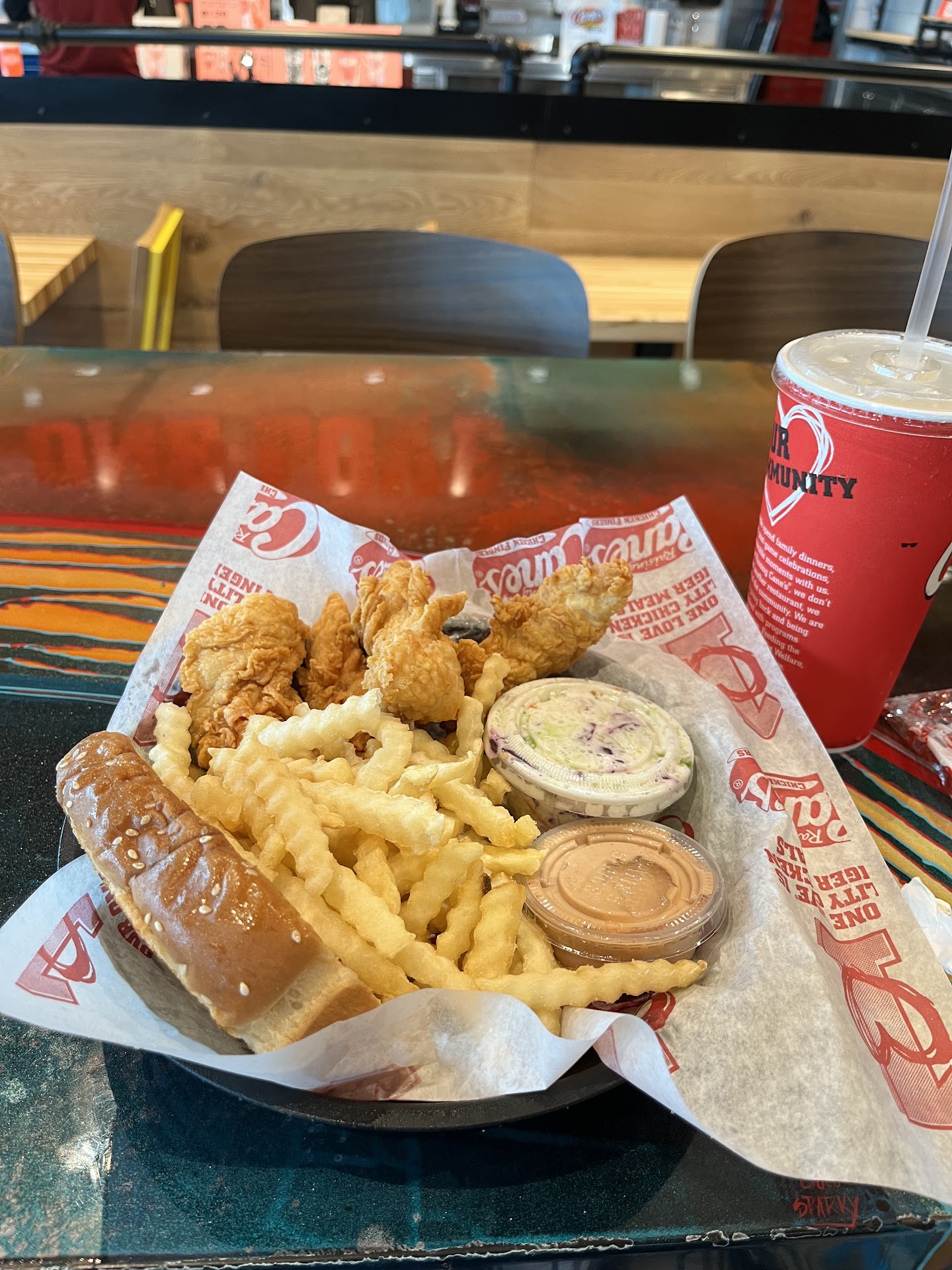 First of all, the drive-thru and its made-up traffic laws are very confusing for 1st time customers. The drive-thru was pretty stacked and took probably 15-20 minutes to get through. The employees were civil, but great customer service clearly isn’t a big tenet of Cane’s business model, and this will be problematic having a competitor across the street whom excels in it. It was just a very “McDonald’s” vibe in that respect.