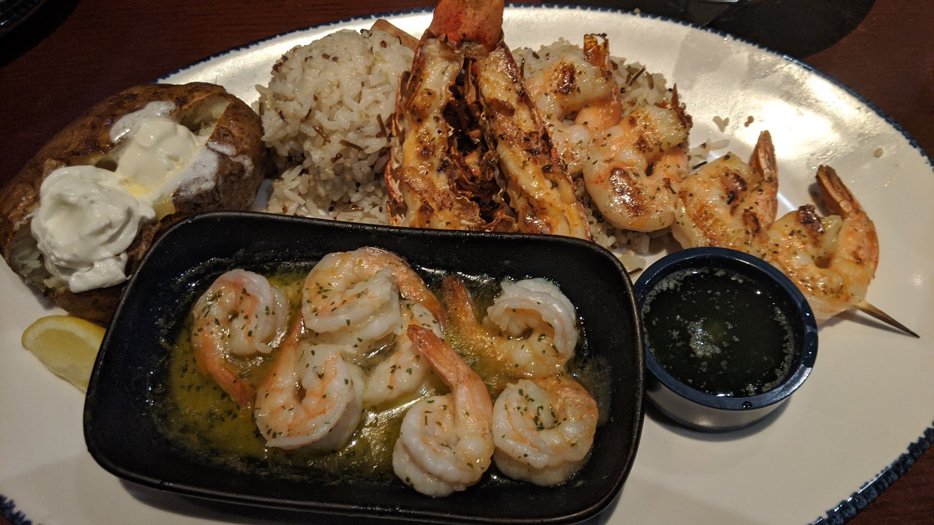 Main Entree: When the entree arrived it was missing the cocktail sauce for the breaded shrimp. Also, I did not receive crackers for the crab. The shrimp scampi was sub par. Part of them were under done. The crab legs were cooked but clearly had been sitting in the pot for to long as the shells were soggy. Lobster was OK but nothing that was exciting.