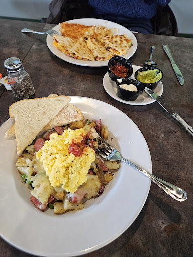 My partner made an excellent choice with the breakfast quesadilla, choosing ham as the meat. The tortilla was crisped just so, and the fillings were in perfect proportion. Out of proportion dishes are somewhat of a pet peeve of mine. In the case of the breakfast quesadilla, there are often too many eggs, so the flavor of the griddled tortilla is lost. Not so with this example. Every bite had just the right texture and blend of flavors, and I was hard pressed to not eat two breakfasts! It was also served with generous helpings of salsa (mild), guacamole, and sour cream. All of which complimented the dish very well.