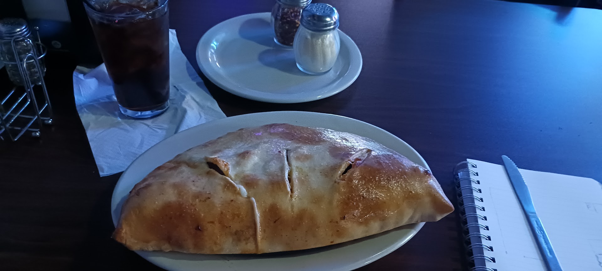 First of all the staff and service was amazing. But that's where the good ended. This place is a bar, not a restaurant. There really is no restaurant seating and it's full of nothing but bar stools. It's very dark and has slot machines. I would not recommend bringing anyone under the age of 21 to this place. Their menus are paper and not even real menus. There were a lot of good reviews about their calzone so I ordered it. It was the blandest thing I've ever eaten and the bread was overcooked and hard. Even their pepperoni had no flavor. The bread didn't have any garlic or butter and there were no herbs or seasoning on the inside of the calzone. Since this was a bar not a restaurant, there were several regulars at the bar having a good old time being rowdy and raunchy. Didn't bother me in the least but it did bother me that there was a 7-year-old girl and a 10 year old boy sitting right behind these regulars. I would not want my children around people who were dropping the f-bomb every other word. And all of the staff knew all the regulars that came in which is awesome for the regulars except that if you know your regulars you probably shouldn't have children in this bar. Because this is a bar and not a restaurant, expect to enter and leave this place through a cloud of smoke.