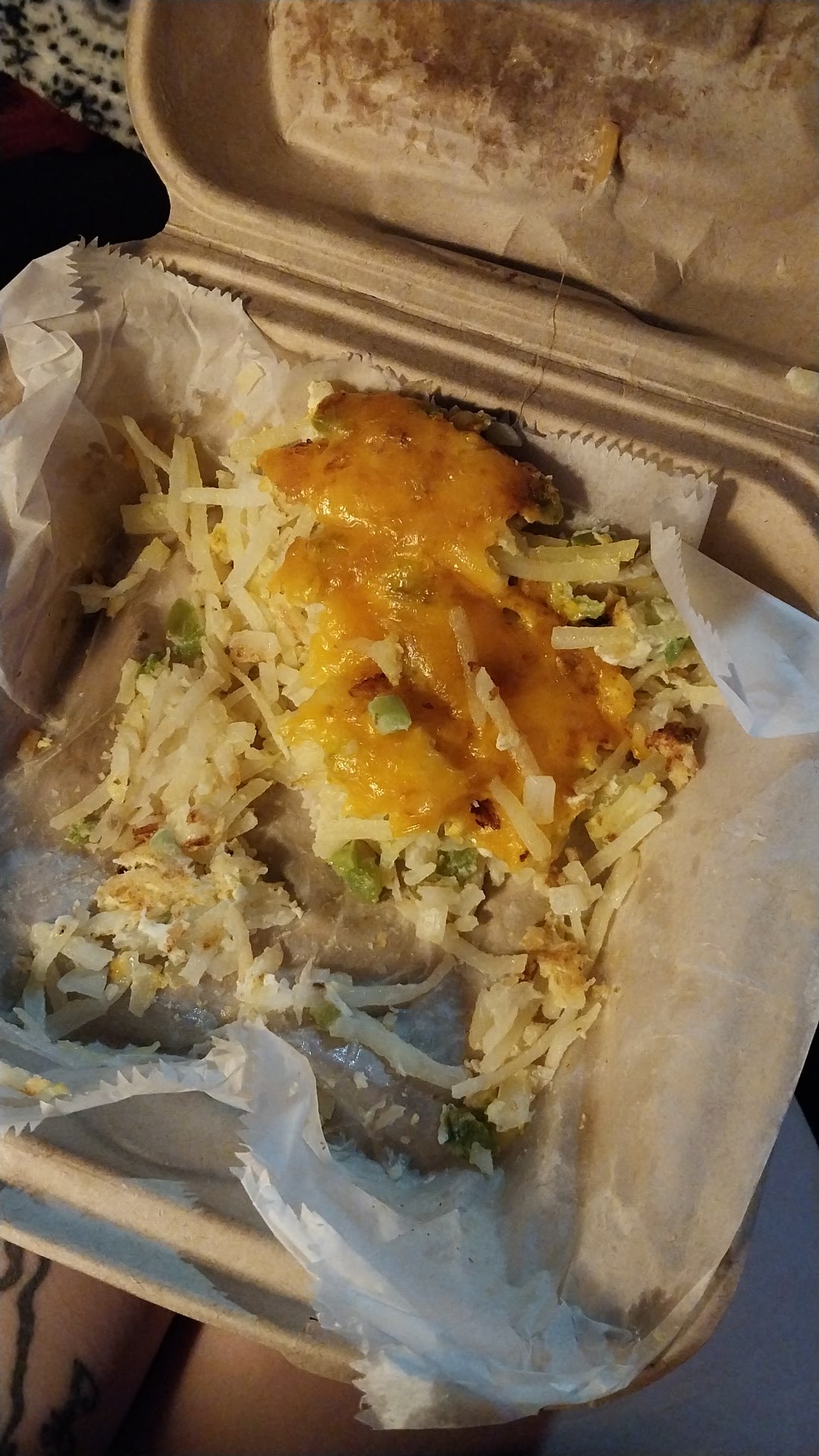 Get home, like I said I live right down the street. Obviously my food was just sitting somewhere. Everything tasted like the cardboard boxes my food came in. The eggs were trash. The pancakes were the worst I ever had in my life and they gave me a chemical filled syrup that made it worse. Oh, the best part was half way through my shipwreck I found something slimey in my food. Looked like a booger or snot rocket. Ruined my entire appetite.