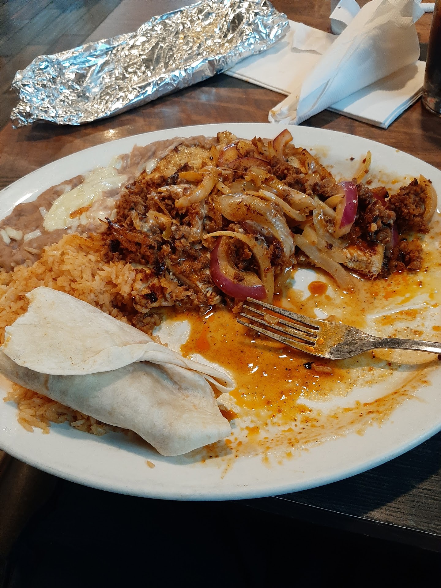 Food comes out—fajitas, mostly shrimp. Decent flavor. But the filler? Unholy. I’m talking pile of onions that could qualify as a side dish. Try pulling a tortilla apart? It rips like a Dollar Tree napkin. Embarrassing.