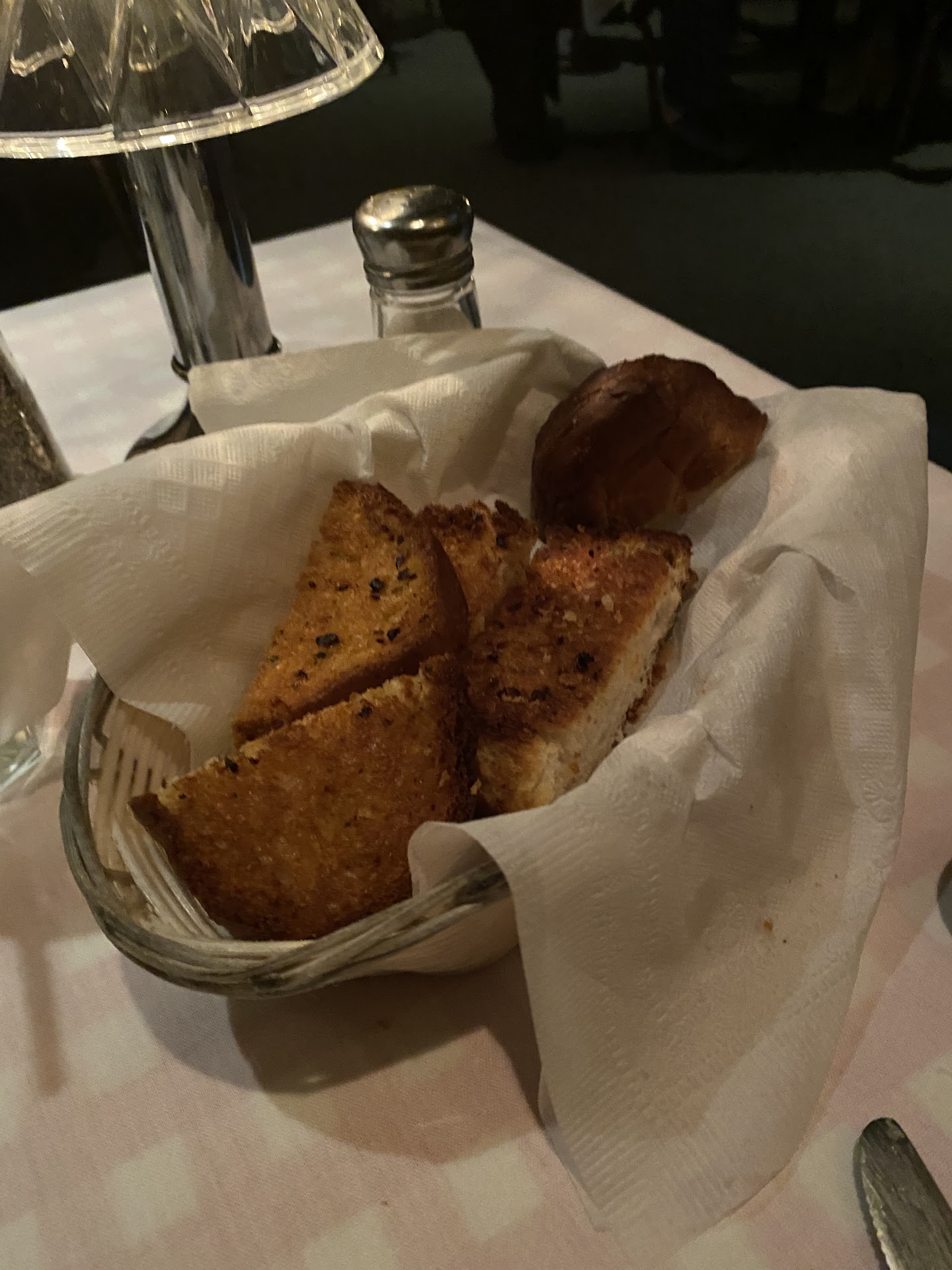 MEALS; we started with the baked mozzarella, I definitely recommend it -delicious. Salads were fresh and crisp, our three entrees were lasagna, shrimp fettuccine Alfredo, Italian sausage diavolo. Each portion was mammoth (easily enough left for second meals), prepared to perfection, presentation was top notch. Garlic bread was crisp, delicious, and Westley our waiter kept checking to see if we needed more garlic bread. Did I mention we were stuffed and each left with enough for a second large meal! But that chocolate cake I saw in the reviews was irresistible so what the heck why not! It was a slice big enough for 3 people, moist, flavorful, a great way to finish.
