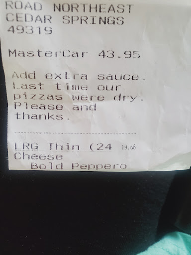 Read moreOrdered pizza and cheesy bread sticks at the Cedar Springs Michigan store at dinnertime. When picking it up, was told it would be a few minutes longer. After waiting 10 minutes, discovered the order was sitting in the warmer all that time. The worker just threw it on the counter and discovered the pizza broke apart and the toppings were spilled all over the box. The box of triple cheese bread sticks were very dry and looked like there were not as many in the box. This is not the first this has happened. We usually like Jetts Pizza but this has been very...