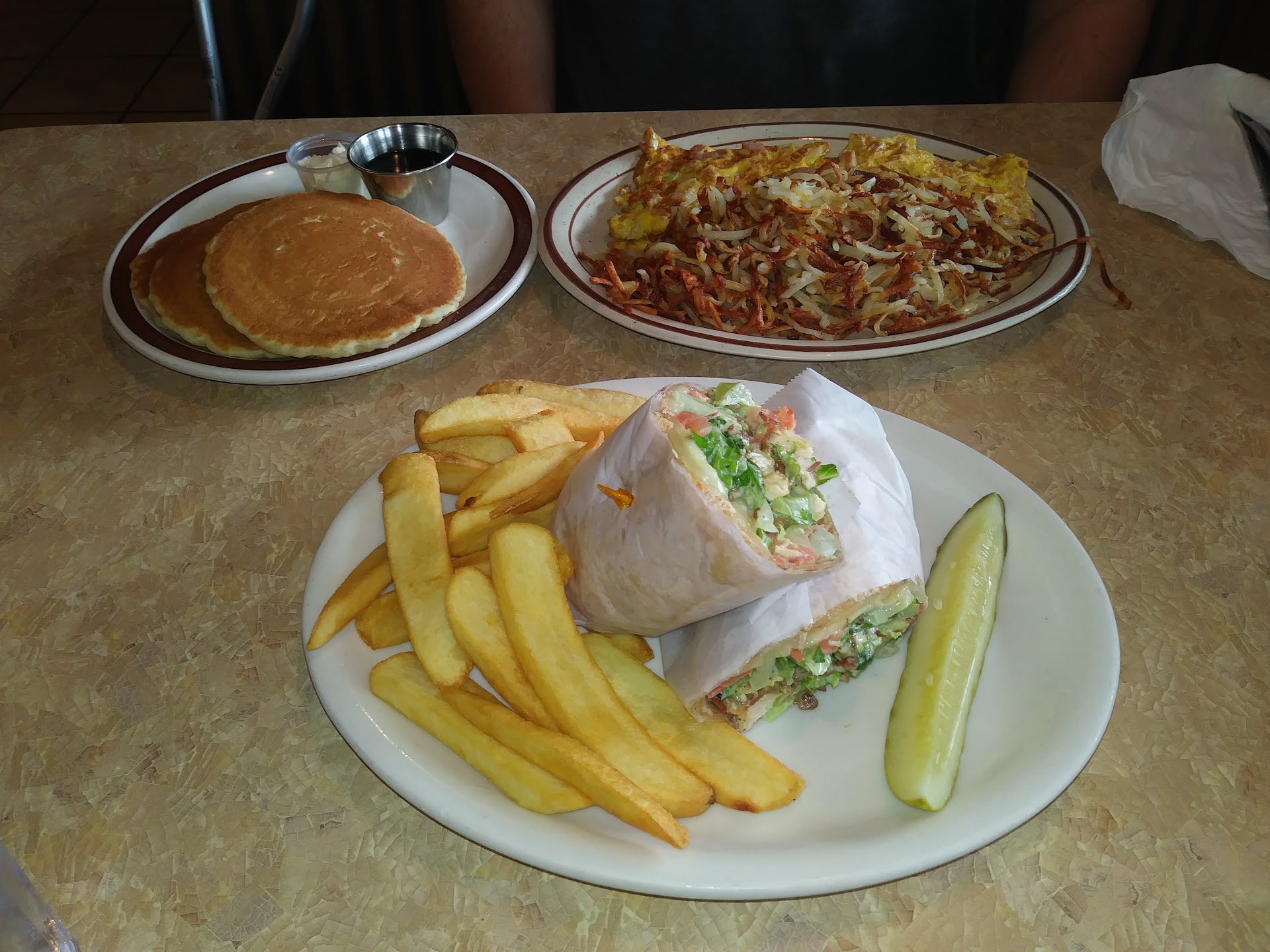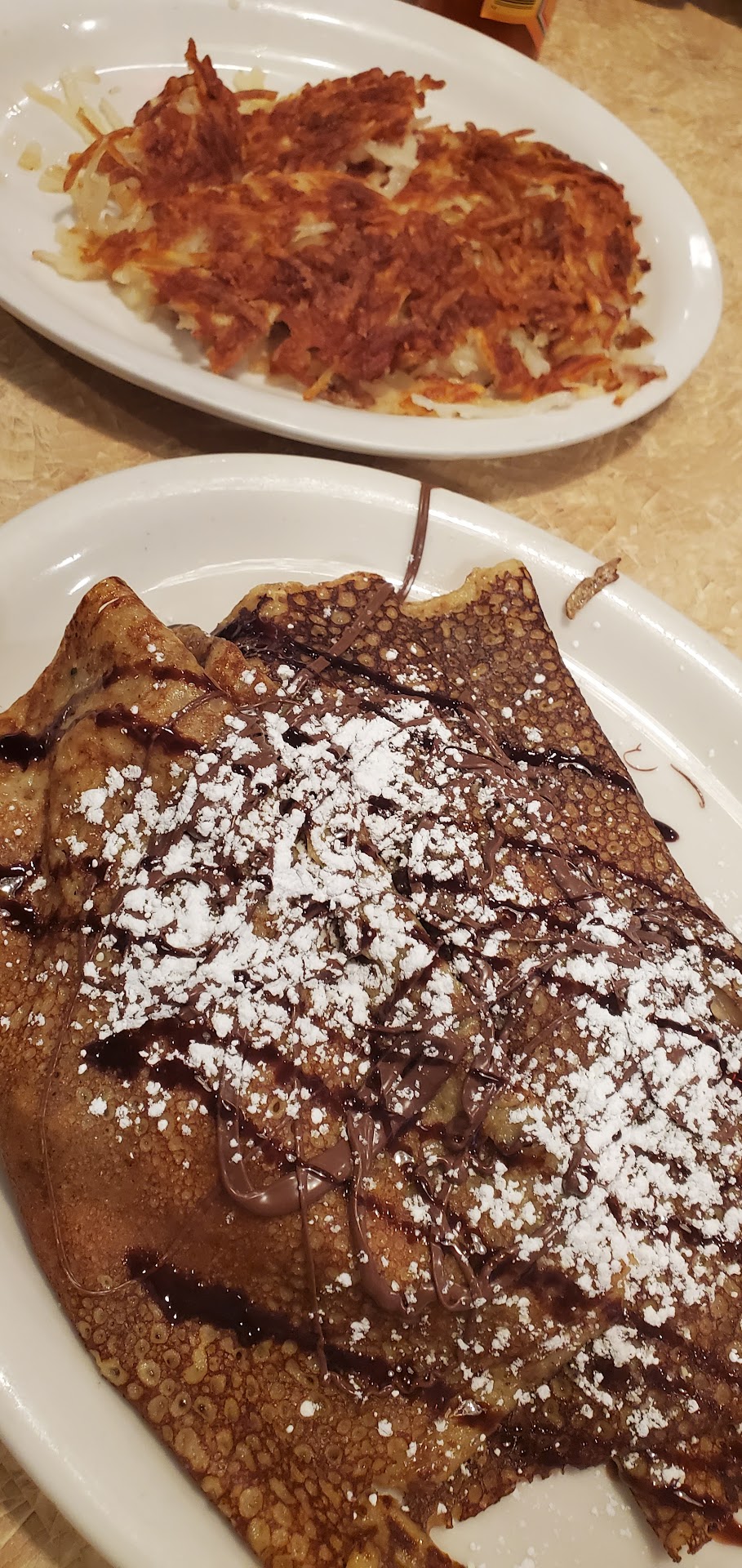 Read moreI was a disappointed today after my family went out for breakfast. We usually come here a lot and I decided to stray away from my "usual" order of crepes and go with the graceland pancakes as I've been eyeing them up for quite some time. When they came to the table I saw little flakes of black which I assumed to be chocolate chips baked in which wasn't in the description, but I ate it anyway. My first bite was gross, it just tasted of burnt-ness for lack of a better term, so that's when I realized the specks of black were just burnt bits. Figuring it was just the one bite I ate more and I didn't taste any peanut butter chips and I was looking forward to that the most. While I was taking apart the cakes searching for them I didn't find one peanut butter chip and to my surprise the bottom two pancakes were burnt to a crisp on the bottom. I couldn't eat it anymore unfortunately because it was so gross and burnt. The waitress took them off my bill which was very kind, but I sadly went home hungry. We will be returning, but I guess I will just stick to my crepes. How those pancakes ever left the kitchen is beyond me and extremely disappointing for such a great...