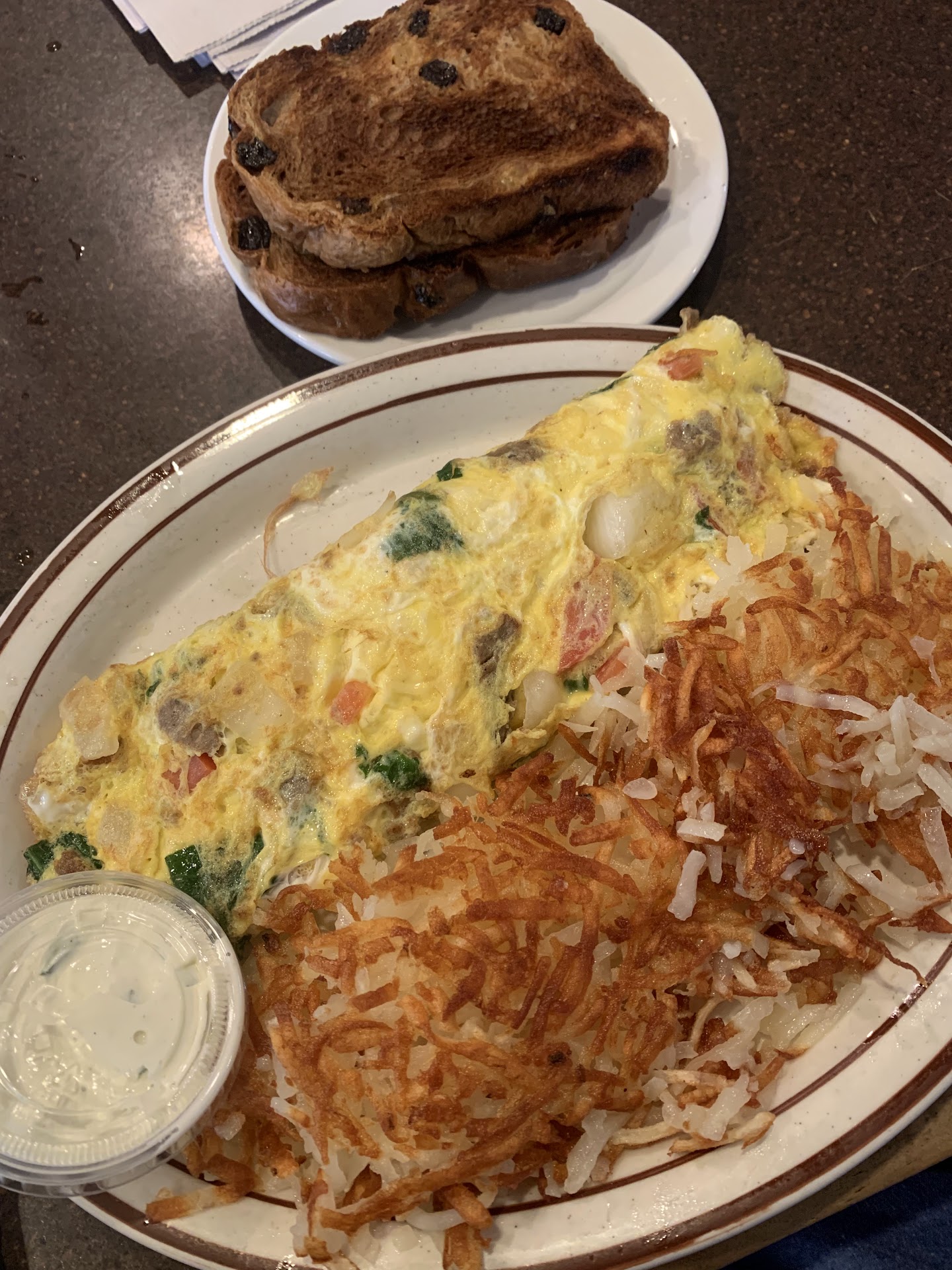 As for the reason I came in for the Churro French Toast was extremely crunchy and flavorful. The only recommendation I could make was that the icing was mainly over the first slice of toast so maybe just place the icing as you stack the toast up.