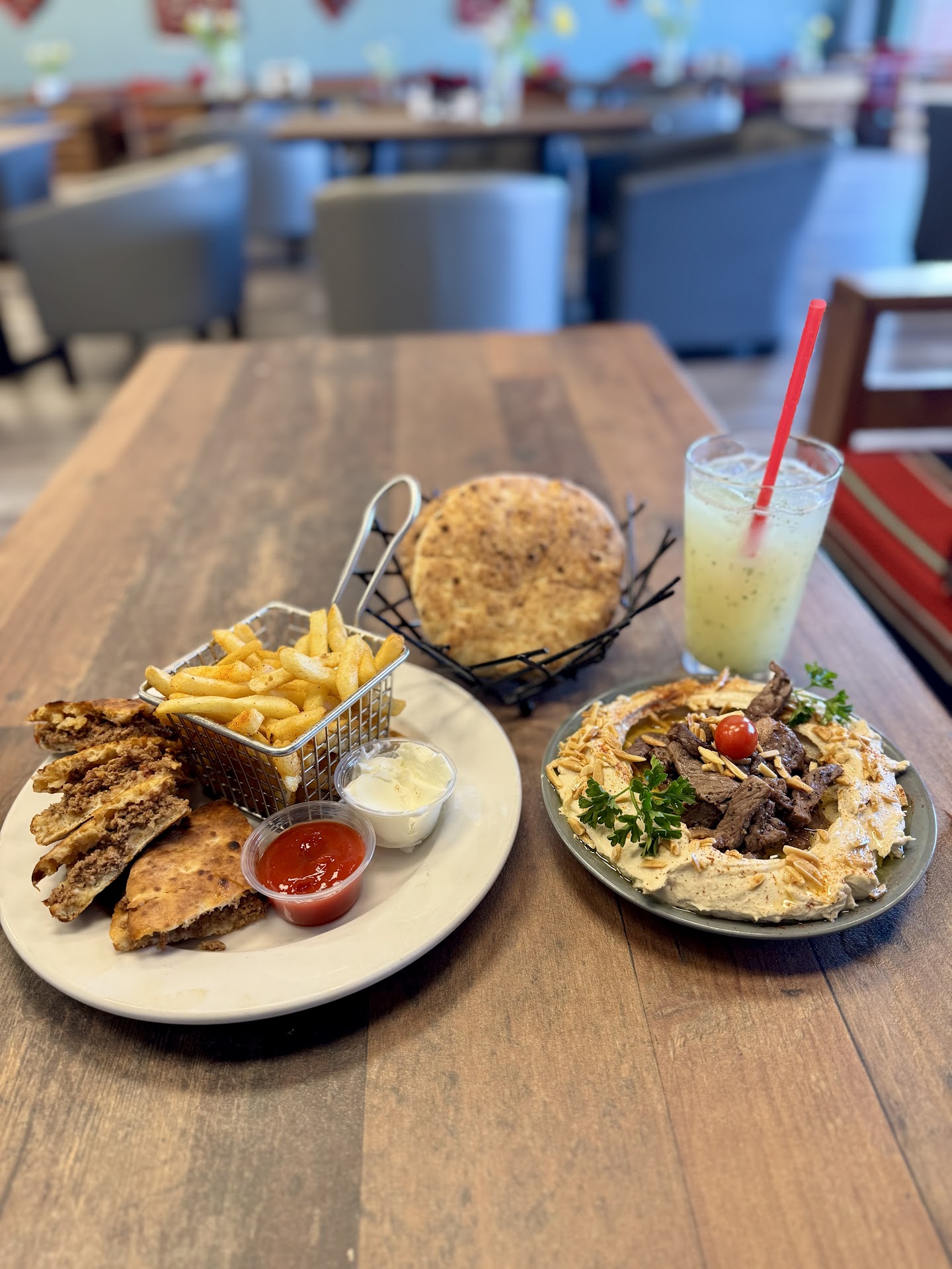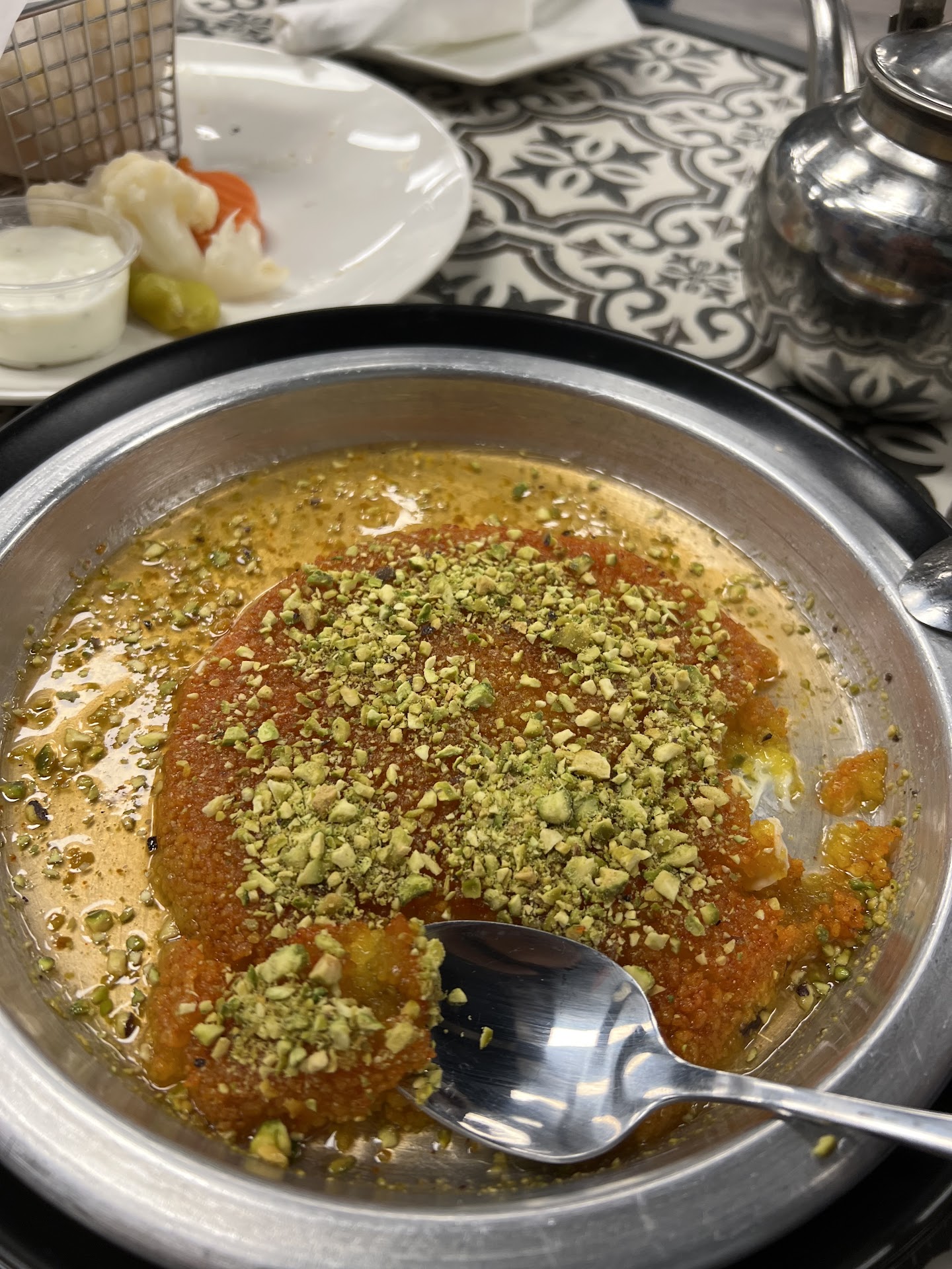 I heard really good reviews about this place from friends but from the moment I walked in everything exceeded expectation at every level. The decor and ambiance is comparable to top lounges/restaurants Iāve visited in the Middle East , I can tell they focused on tiny details and I believe they imported their furniture from overseas to mimic an old traditional setting that you would rarely find any where around the US. The food tastes better than food Iāve tried back home , they are very generous when it comes to the ingredients use like the tahini used in the hummus (most places try to use low cost ingredients but this is definitely not one of them). They also make their pita in-house and the shawarma / falafel is a must try . We got Knafeh for desert and the picture I posted says it all .I havenāt tried the other items but I heard everything is very good and portions are very generous. We also order tea and hookah , the tea came in a traditional pot and done the traditional way , the hookah is also really good and the flavour lasted for at least 3 hrs. Overall you can tell the owners are trying to go above and beyond with the service provided. I will be back tho try other items on the menu and they said they will also be adding more stuff...