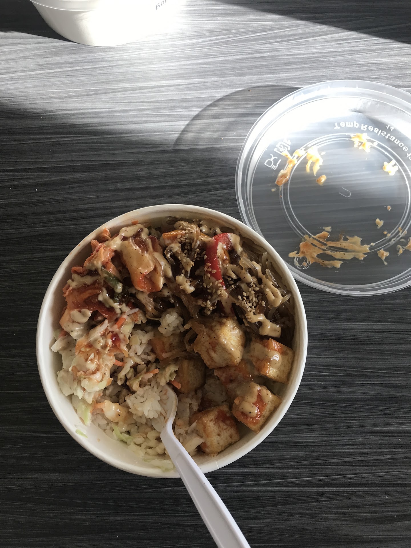 Read moreA little disclaimer before I dig into this place: I’m known as the one who will eat anything. Everywhere, except for now here. For the high price point, it was nearly inedible. Dry, unflavored, and strangely textured food that has clearly been sitting out all day if not multiple days. I got a mango iced tea, which could only be described as “water with a hint of mango tea”. We all ordered different bowls and all were equally disappointing: totaling about $100 for 4 people, which would be understandable if the food was even a 6/10. There wasn’t any service to review. It was a kiosk, then someone serving the goop dishes at a counter with no words exchanged. The atmosphere was purchased off of Temu, complete with no air circulation. Outside in 85° weather was cooler. For the hundreds of similarly priced, higher quality Korean right down the street, don’t waste your time here. If I could give 0...