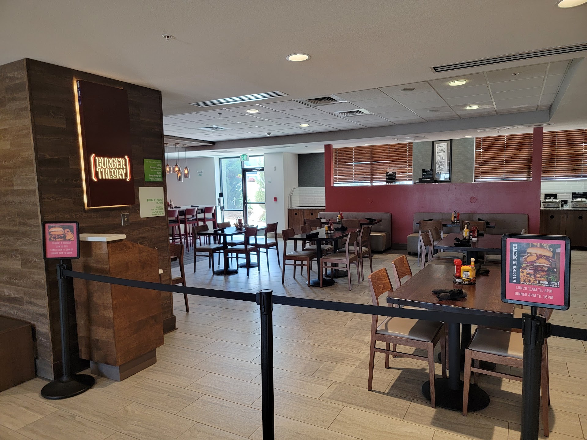 It's not closed. But it sure looks like it is. The food is good, and our server was nice, but I don't know how they will stay in business if they look closed. If you come in the door that's indicated as the restaurant and not the Holiday Inn, the lights are off and there are straps across the restaurant. It looks closed. If you are persistent, you discover you can walk in by the front desk. It was completely empty, and I couldn't help but wonder if it's because the entrance is so wildly uninviting. The prices are way high too, not like a regular Burger Theory, which are more in line with upscale fast food. These prices are more like hotel restaurant prices. You do get good food, but not good enough to pay hotel prices. So not sure why we were the only party present for 2 hours at lunchtime, but...